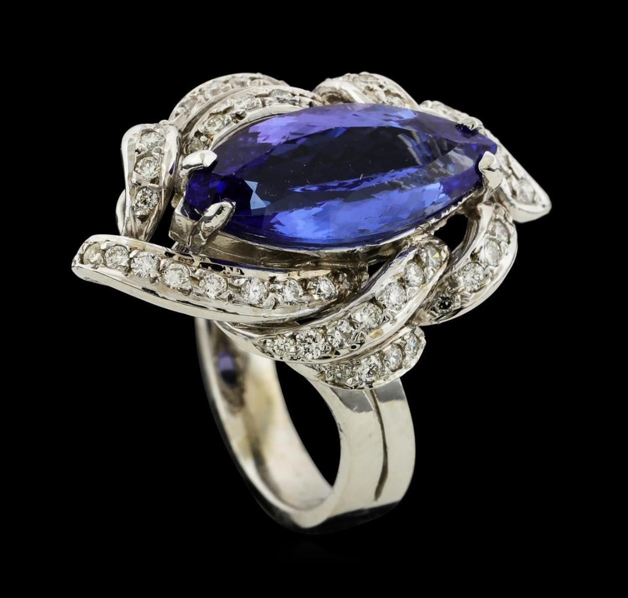 One electronically tested 14KT white gold lady's cast fashion ring with a freeform diamond wreath with a bright polish finish. The featured lady's ring has a split shank measuring 3.36 millimeters wide. Identified with markings of 'K14'. Condition is new, good workmanship. Containing: One prong set marquise modified brilliant cut natural tanzanite, measuring 16.40 x 7.18 x 4.67mm, (depth est.) 10%. bulge factor, approximate weight of 3.81ct., clarity is eye clean, medium, moderately strong, violetish blue color, (GIA vB 5/4), cut is very good. Transmitting light with no distortion, transparent. Colored gemstones are presumed to have been subjected to commonly used enhancement processes. Graded in the setting. Thirty-Three prong set round brilliant cut diamonds, measuring 1.50 - 1.40 x 0.87mm (depth est.) approximate total weight of 33 Stones = 0.36ct. Graded in the setting. Clarity VS-2 to SI-2. Color: H - I Cut Good Ten prong set round brilliant cut diamonds, measuring 1.20 - 1.00 x 0.66mm (depth est.) approximate total weight of 10 Stones = 0.04ct. Graded in the setting. Clarity VS-2 to SI-2. Color: H - I Cut Good. Total Weight of Colored Stones 3.81ct.. Total Weight of Diamonds 0.40ct.. Total Weight of Ring 7.30gm. GAS Appraised.
