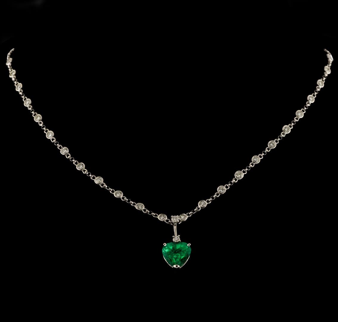 One electronically tested 14KT white gold lady's cast fashion pendant & chain 16.0' long, 1.6mm round cable link with a lobster claw clasp with a bright polish finish. The featured lady's pendant has an attached diamonds-by-the-yard chain. Identified with markings of '585'. Condition is like new, good workmanship. Containing: One prong set heart modified brilliant cut natural emerald, measuring 9.55 x 10.60 x 6.82mm, (depth est.) approximate weight of 3.70ct., clarity is slightly included, medium, moderately strong, green color, (GIA G 5/4), cut is good. Transmitting light with a minimum of distortion, transparent. Indications of oil residue. Naturally occurring internal & external characteristics are present. Colored gemstones are presumed to have been subjected to commonly used enhancement processes. Graded in the setting. Two prong set round brilliant cut diamonds, measuring 2.60 - 2.50 x 1.53mm (depth est.) approximate total weight of 2 Stones = 0.12ct. Graded in the setting. Clarity I-1. Color: H Cut Good Forty-Two bezel set round brilliant cut diamonds, measuring 2.40 - 2.30 x 1.46mm (depth est.) approximate total weight of 42 Stones = 2.10ct. Graded in the setting. Clarity SI-2 to I-1. Color: H - I Cut Good. Total Weight of Colored Stones 3.70ct.. Total Weight of Diamonds 2.22ct.. Total Weight of Pendant & Chain 8.30gm. GAS Appraised at $10,150.00.