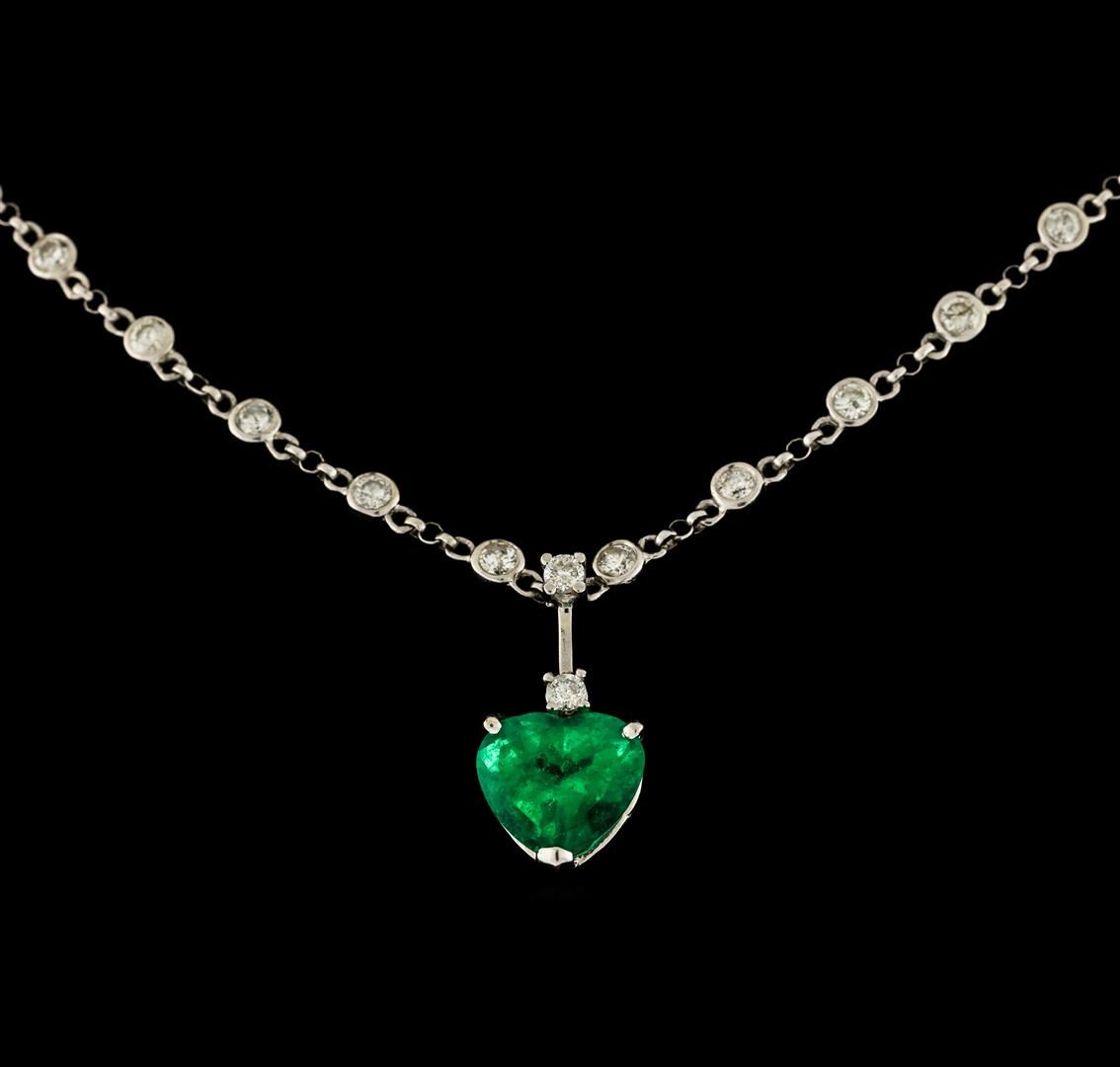 One electronically tested 14KT white gold lady's cast fashion pendant & chain 16.0' long, 1.6mm round cable link with a lobster claw clasp with a bright polish finish. The featured lady's pendant has an attached diamonds-by-the-yard chain. Identified with markings of '585'. Condition is like new, good workmanship. Containing: One prong set heart modified brilliant cut natural emerald, measuring 9.55 x 10.60 x 6.82mm, (depth est.) approximate weight of 3.70ct., clarity is slightly included, medium, moderately strong, green color, (GIA G 5/4), cut is good. Transmitting light with a minimum of distortion, transparent. Indications of oil residue. Naturally occurring internal & external characteristics are present. Colored gemstones are presumed to have been subjected to commonly used enhancement processes. Graded in the setting. Two prong set round brilliant cut diamonds, measuring 2.60 - 2.50 x 1.53mm (depth est.) approximate total weight of 2 Stones = 0.12ct. Graded in the setting. Clarity I-1. Color: H Cut Good Forty-Two bezel set round brilliant cut diamonds, measuring 2.40 - 2.30 x 1.46mm (depth est.) approximate total weight of 42 Stones = 2.10ct. Graded in the setting. Clarity SI-2 to I-1. Color: H - I Cut Good. Total Weight of Colored Stones 3.70ct.. Total Weight of Diamonds 2.22ct.. Total Weight of Pendant & Chain 8.30gm. GAS Appraised at $10,150.00.