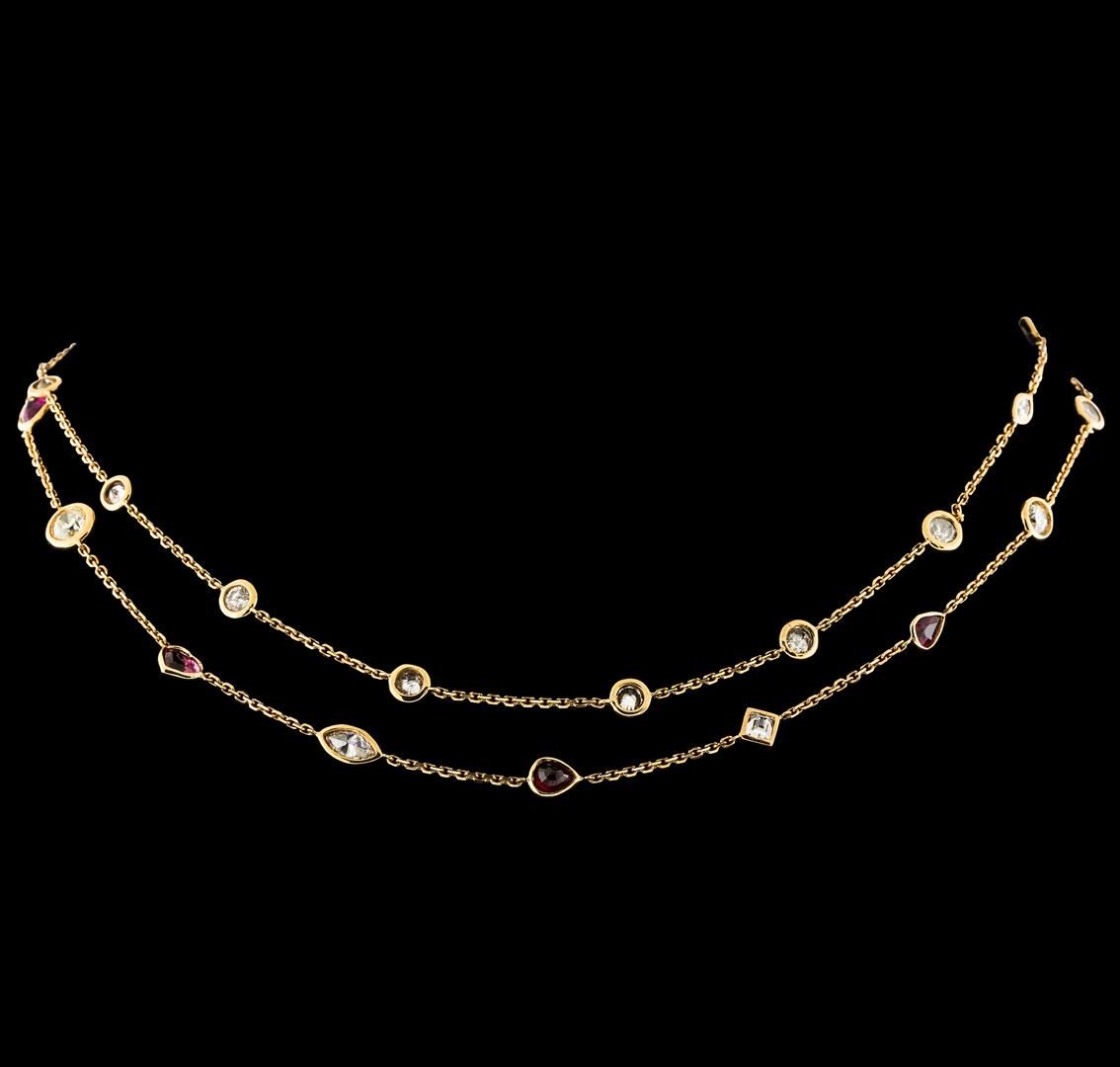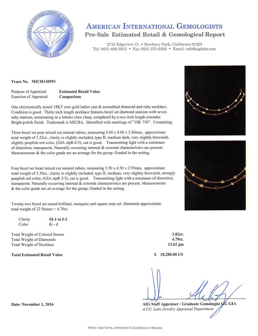 One electronically tested 18KT rose gold ladies cast & assembled diamond and ruby necklace. Thirty inch length necklace features bezel set diamond stations with seven ruby stations, terminating in a lobster claw clasp, completed by a two inch length extender. Bright polish finish. Trademark is MICHA. Identified with markings of '18K 750'. Condition is good. Containing: Three bezel set pear mixed cut natural rubies, measuring 6.00 x 4.00 x 2.60mm, approximate total weight of 1.52ct., clarity is slightly included, type II, medium dark, very slightly brownish, slightly purplish red color, (GIA slpR 6/3), cut is good. Transmitting light with a minimum of distortion, transparent. Naturally occurring internal & external characteristics are present. Measurements & the color grade are an average for the group. Graded in the setting. Four bezel set heart mixed cut natural rubies, measuring 5.50 x 4.50 x 2.93mm, approximate total weight of 2.30ct., clarity is slightly included, type II, medium, very slightly brownish, strongly purplish red color, (GIA stpR 5/3), cut is good. Transmitting light with a minimum of distortion, transparent. Naturally occurring internal & external characteristics are present. Measurements & the color grade are an average for the group. Graded in the setting. Twenty-Two bezel set round brilliant, marquise and square step cut diamonds approximate total weight of 22 Stones = 4.79ct. Clarity SI-1 to I-2. Color: G - J. Total Weight of Colored Stones 3.82ct.. Total Weight of Diamonds 4.79ct.. Total Weight of Necklace 13.62gm. AIG Appraised at $18,280.00.