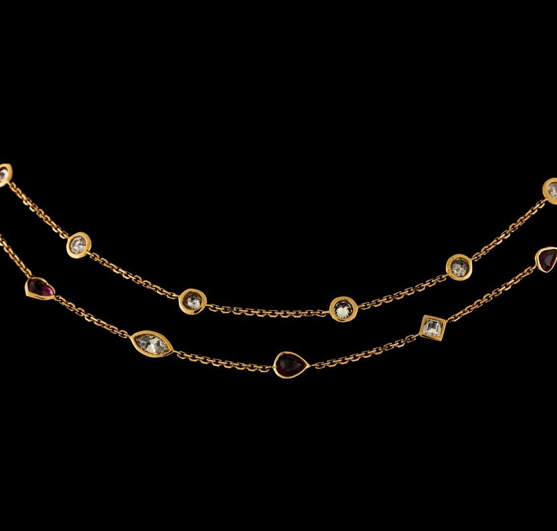 One electronically tested 18KT rose gold ladies cast & assembled diamond and ruby necklace. Thirty inch length necklace features bezel set diamond stations with seven ruby stations, terminating in a lobster claw clasp, completed by a two inch length extender. Bright polish finish. Trademark is MICHA. Identified with markings of '18K 750'. Condition is good. Containing: Three bezel set pear mixed cut natural rubies, measuring 6.00 x 4.00 x 2.60mm, approximate total weight of 1.52ct., clarity is slightly included, type II, medium dark, very slightly brownish, slightly purplish red color, (GIA slpR 6/3), cut is good. Transmitting light with a minimum of distortion, transparent. Naturally occurring internal & external characteristics are present. Measurements & the color grade are an average for the group. Graded in the setting. Four bezel set heart mixed cut natural rubies, measuring 5.50 x 4.50 x 2.93mm, approximate total weight of 2.30ct., clarity is slightly included, type II, medium, very slightly brownish, strongly purplish red color, (GIA stpR 5/3), cut is good. Transmitting light with a minimum of distortion, transparent. Naturally occurring internal & external characteristics are present. Measurements & the color grade are an average for the group. Graded in the setting. Twenty-Two bezel set round brilliant, marquise and square step cut diamonds approximate total weight of 22 Stones = 4.79ct. Clarity SI-1 to I-2. Color: G - J. Total Weight of Colored Stones 3.82ct.. Total Weight of Diamonds 4.79ct.. Total Weight of Necklace 13.62gm. AIG Appraised.