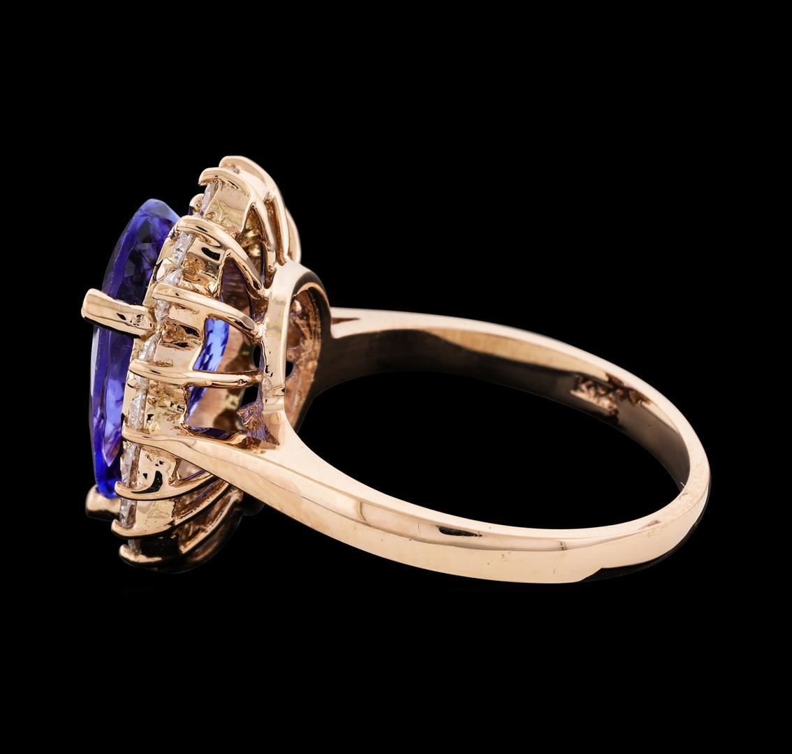 One electronically tested 14KT rose gold lady's cast fashion ring with a cathedral shank with a basket halo with a bright polish finish. The featured lady's ring has a shank measuring 2.07 millimeters wide. Identified with markings of 'K14'. Condition is new, good workmanship. Containing: One prong set pear modified brilliant cut natural tanzanite, measuring 13.50 x 8.30 x 5.18mm, (depth est.) approximate weight of 3.82ct., clarity is eye clean, medium dark, moderately strong, violetish blue color, (GIA vB 6/4), cut is very good. Transmitting light with no distortion, transparent. Colored gemstones are presumed to have been subjected to commonly used enhancement processes. Graded in the setting. Sixteen prong set round brilliant cut diamonds, measuring 2.50 - 2.40 x 1.52mm (depth est.) approximate total weight of 16 Stones = 0.90ct. Graded in the setting. Clarity SI-1 to I-1. Color: H - I Cut Good. Total Weight of Colored Stones 3.82ct.. Total Weight of Diamonds 0.90ct.. Total Weight of Ring 4.90gm.