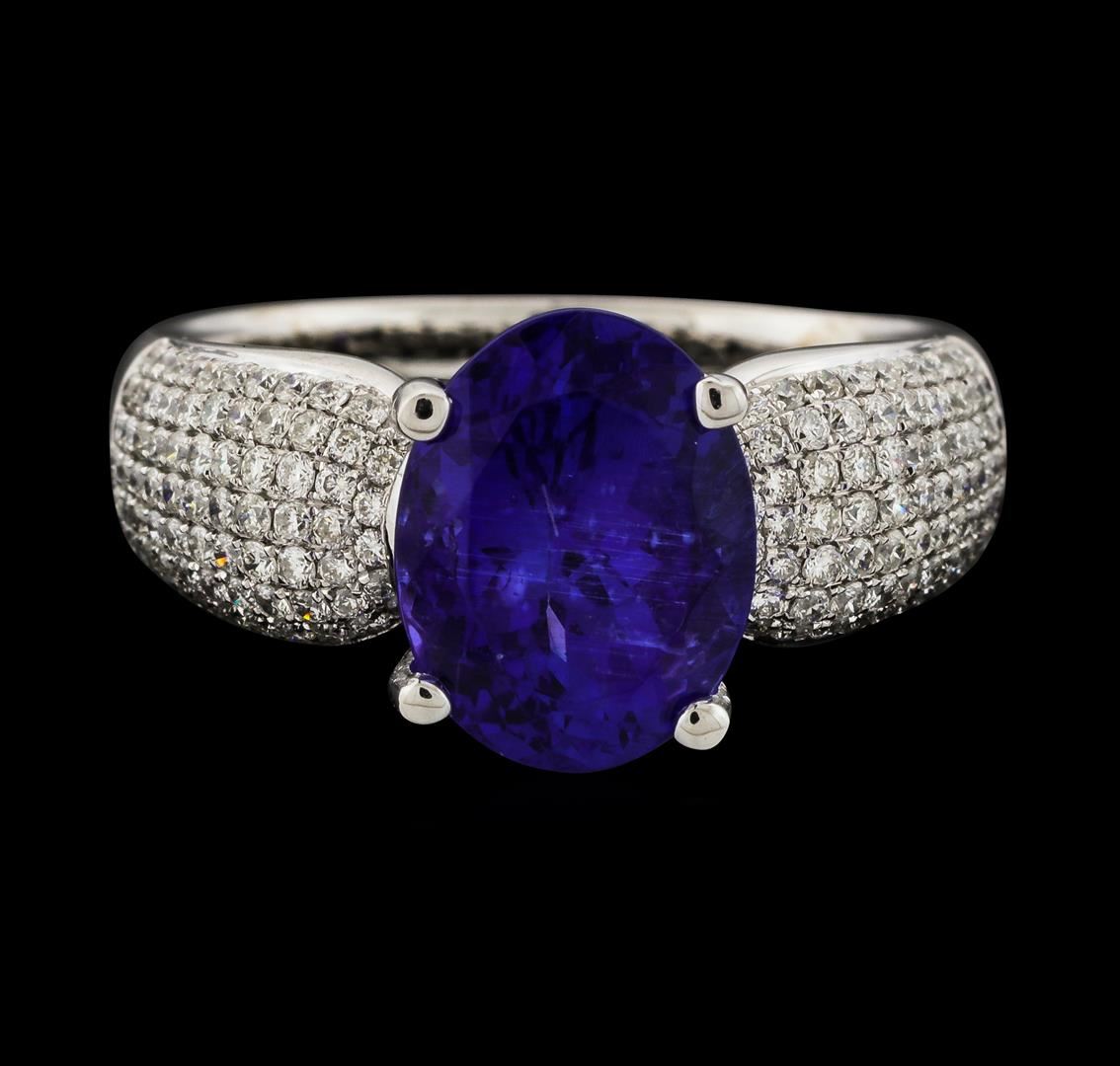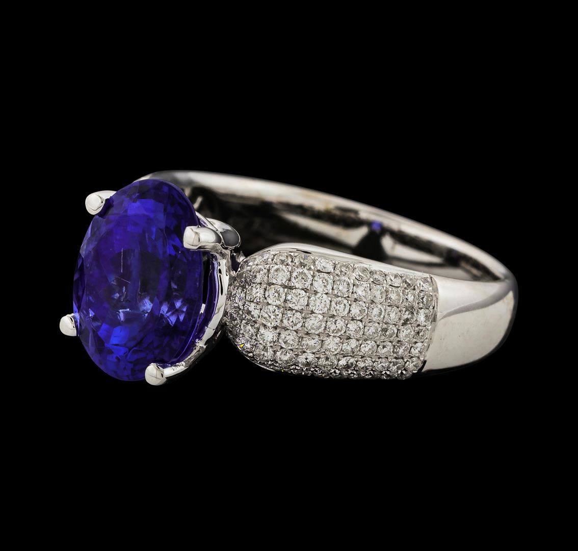 One electronically tested 18KT white gold lady's cast fashion ring with a half round shank with a bright polish finish. The featured lady's ring has diamond encrusted shoulders and a shank measuring 3.00 millimeters wide. Identified with markings of '18K 750'. Condition is new, good workmanship. Containing: One prong set oval modified brilliant cut natural tanzanite, measuring 10.56 x 8.20 x 6.46mm, (depth est.) approximate weight of 3.82ct., clarity is slightly included, medium dark, strong, violetish blue color, (GIA vB 6/5), cut is very good. Transmitting light with a minimum of distortion, transparent. Colored gemstones are presumed to have been subjected to commonly used enhancement processes. Graded in the setting. One Hundred Fifty-Two prong set round brilliant cut diamonds, measuring 1.10 - 1.00 x 0.63mm (depth est.) approximate total weight of 152 Stones = 0.62ct. Graded in the setting. Clarity SI-1 to SI-2. Color: G - H Cut Good. Total Weight of Colored Stones 3.82ct.. Total Weight of Diamonds 0.62ct.. Total Weight of Ring 6.90gm. GAS Appraised at $9,015.00.