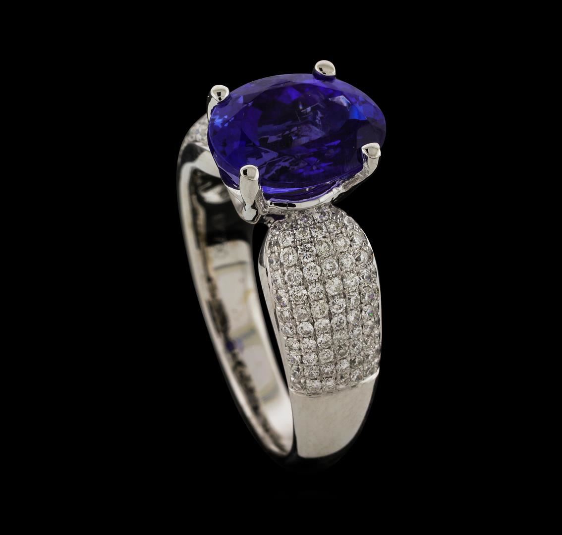 One electronically tested 18KT white gold lady's cast fashion ring with a half round shank with a bright polish finish. The featured lady's ring has diamond encrusted shoulders and a shank measuring 3.00 millimeters wide. Identified with markings of '18K 750'. Condition is new, good workmanship. Containing: One prong set oval modified brilliant cut natural tanzanite, measuring 10.56 x 8.20 x 6.46mm, (depth est.) approximate weight of 3.82ct., clarity is slightly included, medium dark, strong, violetish blue color, (GIA vB 6/5), cut is very good. Transmitting light with a minimum of distortion, transparent. Colored gemstones are presumed to have been subjected to commonly used enhancement processes. Graded in the setting. One Hundred Fifty-Two prong set round brilliant cut diamonds, measuring 1.10 - 1.00 x 0.63mm (depth est.) approximate total weight of 152 Stones = 0.62ct. Graded in the setting. Clarity SI-1 to SI-2. Color: G - H Cut Good. Total Weight of Colored Stones 3.82ct.. Total Weight of Diamonds 0.62ct.. Total Weight of Ring 6.90gm. GAS Appraised at $9,015.00.
