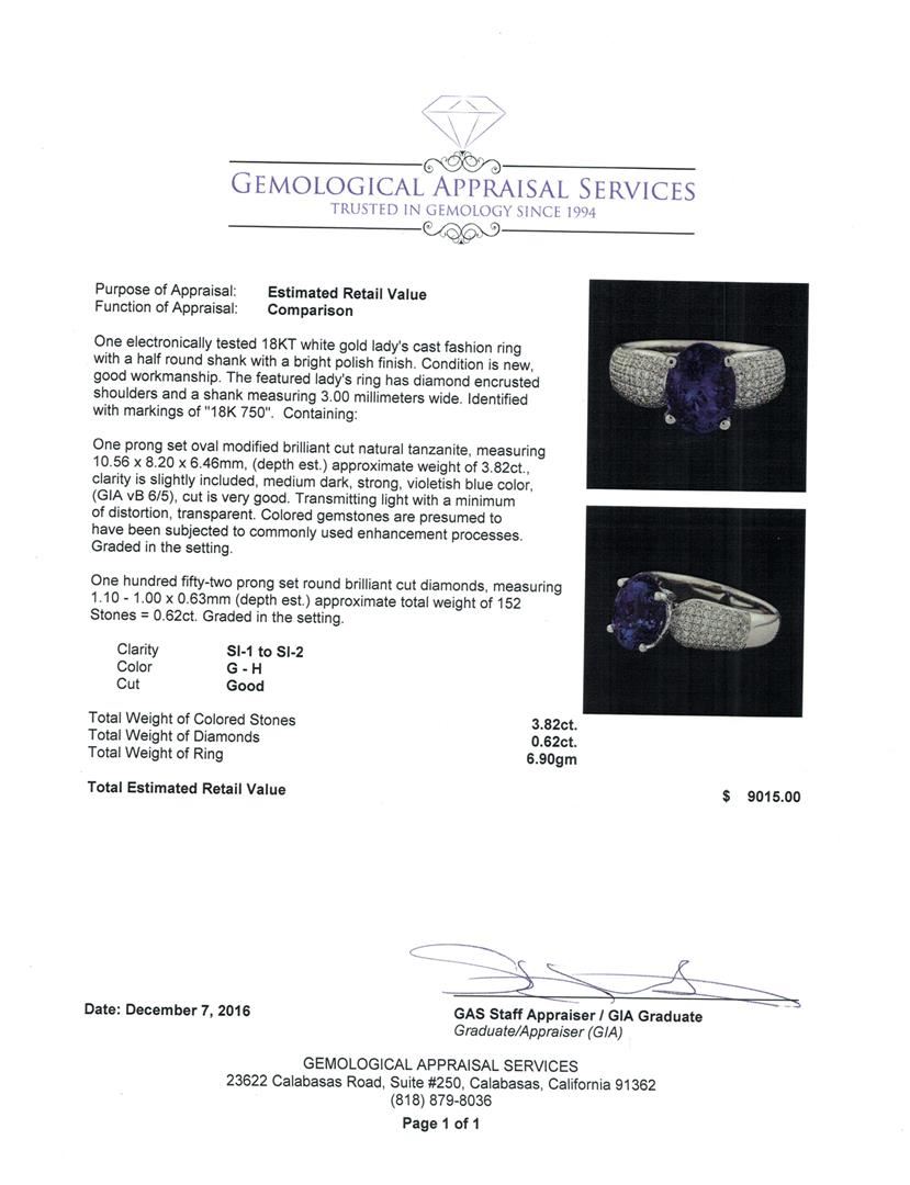 One electronically tested 18KT white gold lady's cast fashion ring with a half round shank with a bright polish finish. The featured lady's ring has diamond encrusted shoulders and a shank measuring 3.00 millimeters wide. Identified with markings of '18K 750'. Condition is new, good workmanship. Containing: One prong set oval modified brilliant cut natural tanzanite, measuring 10.56 x 8.20 x 6.46mm, (depth est.) approximate weight of 3.82ct., clarity is slightly included, medium dark, strong, violetish blue color, (GIA vB 6/5), cut is very good. Transmitting light with a minimum of distortion, transparent. Colored gemstones are presumed to have been subjected to commonly used enhancement processes. Graded in the setting. One Hundred Fifty-Two prong set round brilliant cut diamonds, measuring 1.10 - 1.00 x 0.63mm (depth est.) approximate total weight of 152 Stones = 0.62ct. Graded in the setting. Clarity SI-1 to SI-2. Color: G - H Cut Good. Total Weight of Colored Stones 3.82ct.. Total Weight of Diamonds 0.62ct.. Total Weight of Ring 6.90gm. GAS Appraised at $9,015.00.