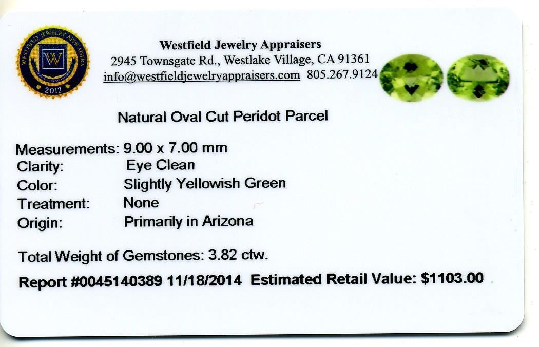 3.82ctw. Natural Oval Cut Peridot Parcel. Westfield Appraised at $1,103.00.