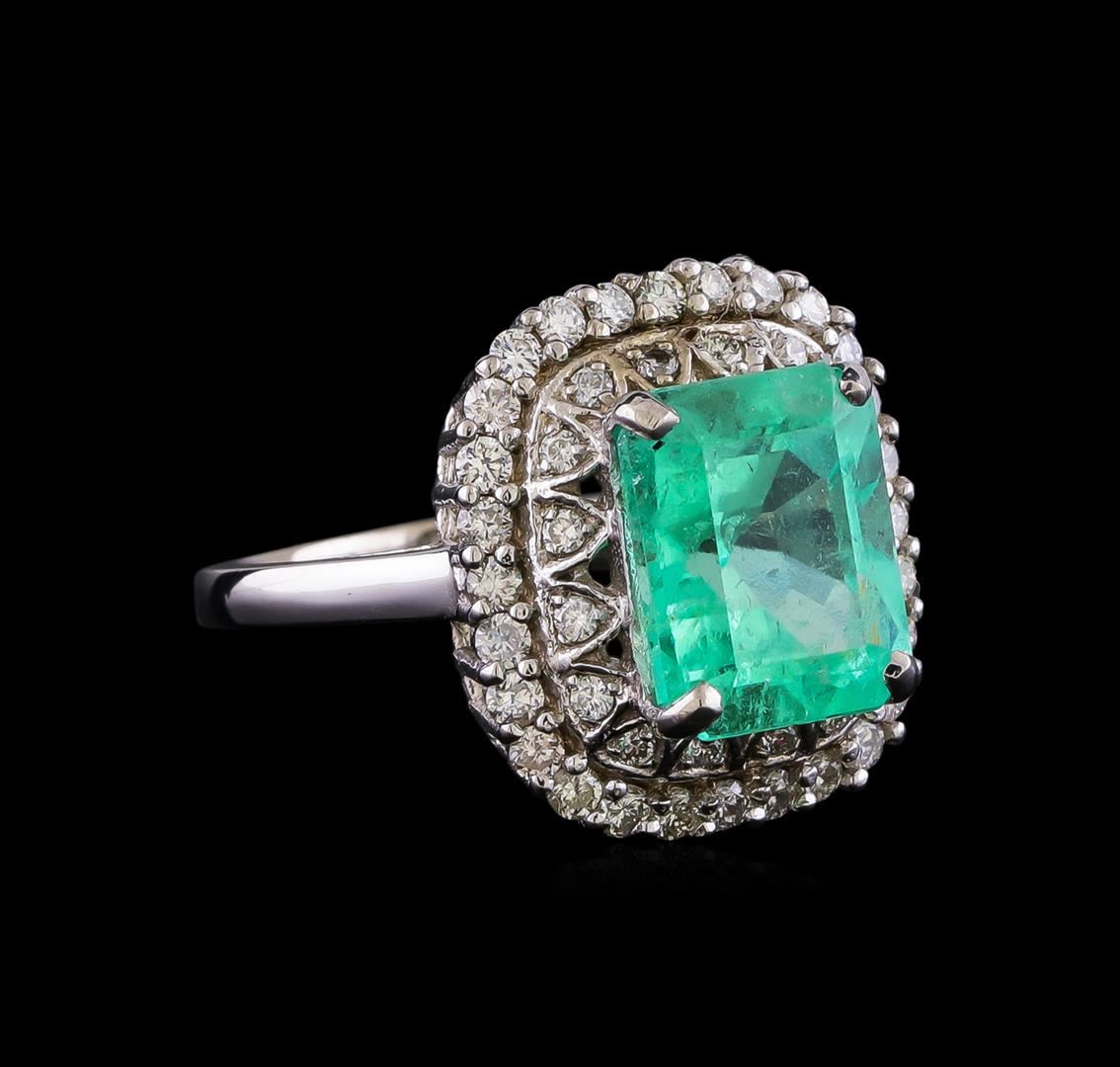 One electronically tested 14KT white gold lady's cast fashion ring with a double basket halo with a bright polish finish. The featured lady's has a shank measuring 1.62 millimeters in width. Identified with markings of "K14". Condition is new, good workmanship. Containing: One prong set emerald step cut natural emerald, measuring 10.68 x 8.64 x 6.45mm, (depth est.) approximate weight of 3.83ct., clarity is slightly included, medium light, moderately strong, green color, (GIA G 4/4), cut is good. Transmitting light with a minimum of distortion, transparent. Indications of oil residue. Naturally occurring internal & external characteristics are present. Colored gemstones are presumed to have been subjected to commonly used enhancement processes. Graded in the setting. Twenty-Eight prong set round brilliant cut diamonds, measuring 1.90 - 1.80 x 1.14mm (depth est.) approximate total weight of 28 Stones = 0.68ct. Graded in the setting. Clarity: SI-1 to SI-2. Color: H - I. Cut Good Sixteen prong set round brilliant cut diamonds, measuring 1.40 - 1.35 x 0.86mm (depth est.) approximate total weight of 16 Stones = 0.17ct. Graded in the setting. Clarity: SI-1 to SI-2. Color: H - I. Cut Good. Total Weight of Colored Stones 3.83ct. Total Weight of Diamonds 0.85ct. Total Weight of Ring 6.60gm. GAS Appraised.