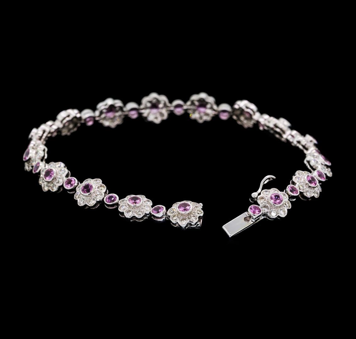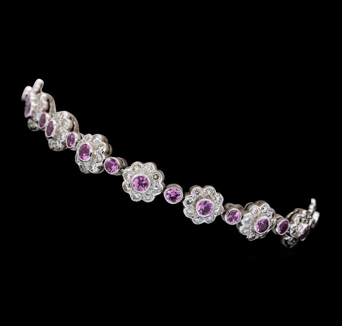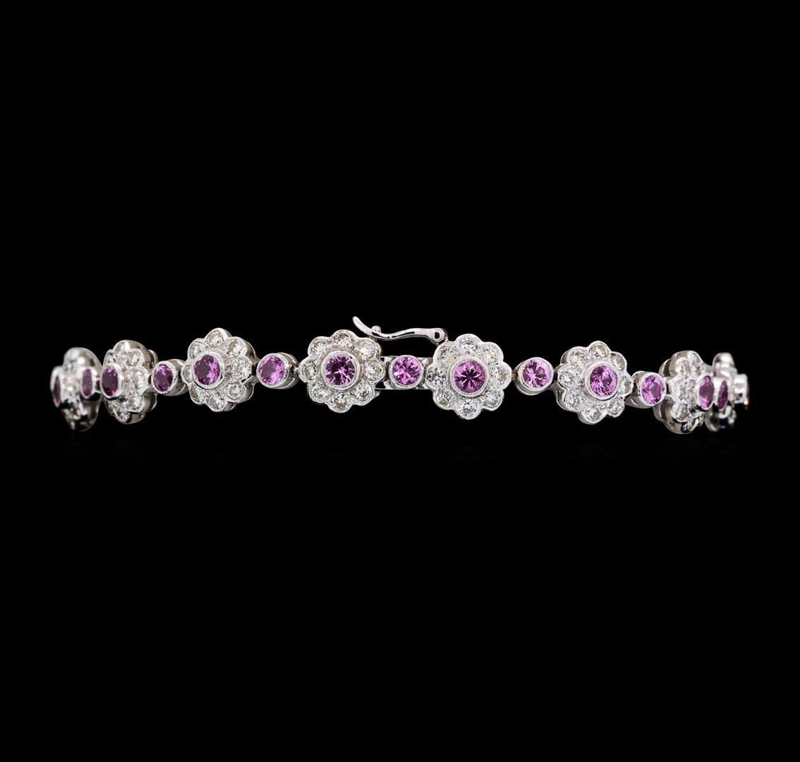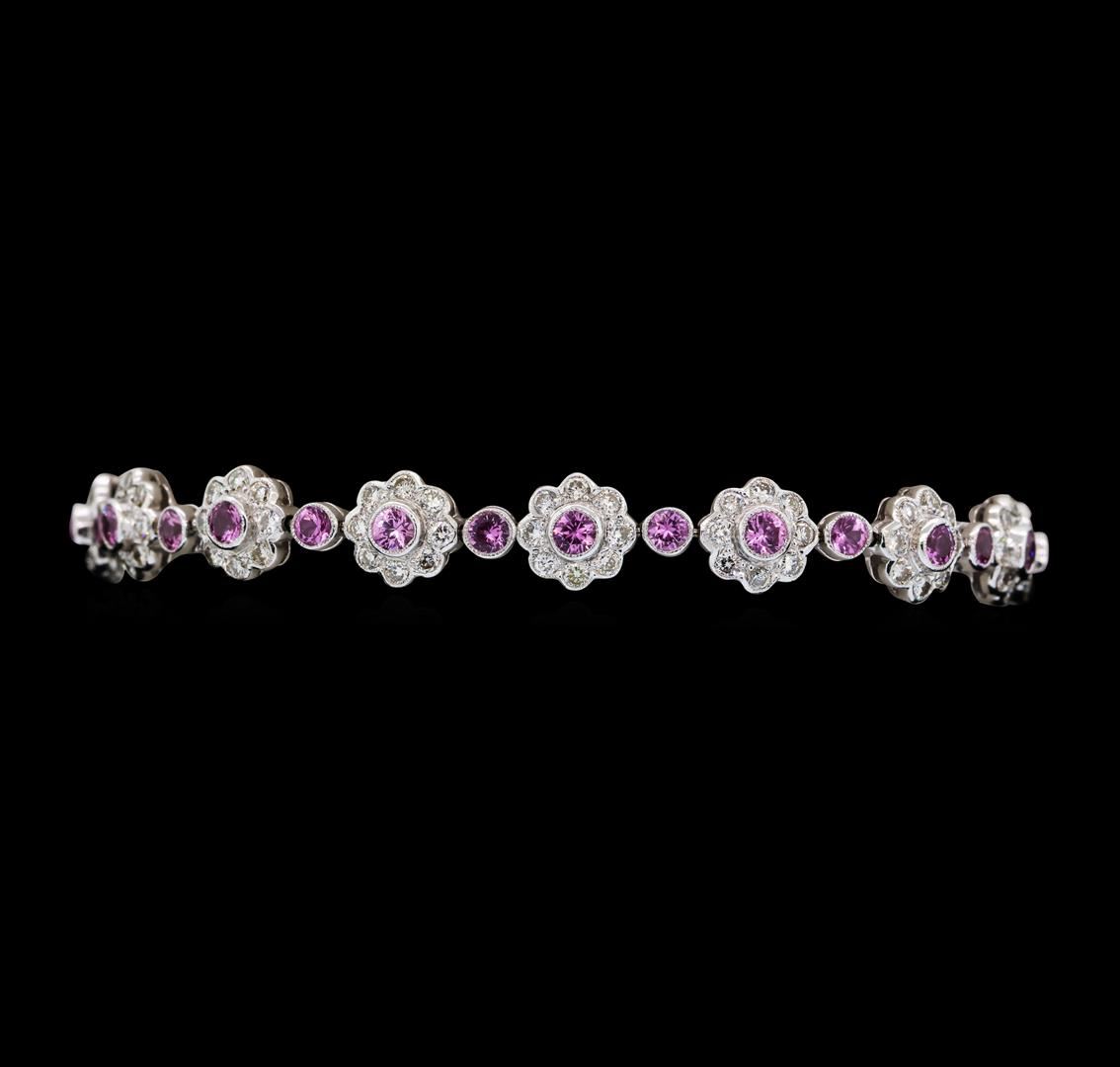 One electronically tested 18KT white gold ladies cast & assembled pink sapphire and diamond bracelet. Seven inch length bracelet features a flexible ribbon of pink sapphires and diamond florets, terminating in a concealed clasp with safety. Bright polish finish with milgrain detailing. Identified with markings of '18K'. Condition is good. Containing: Thirty-two bezel set round mixed cut natural pink sapphires, measuring 2.90 - 2.70 x 1.83 mm, approximate total weight of 3.83ct., clarity is eye clean, medium, very slightly grayish, pink color, (GIA Pk 5/3), cut is good. Transmitting light with no distortion, transparent. Measurements & the color grade are an average for the group. Graded in the setting. One Hundred Twenty-Eight prong set round brilliant cut diamonds, measuring 1.70 - 1.70 x 1.02mm (depth est.) approximate total weight of 128 Stones = 2.49ct. Graded in the setting. Clarity SI-1 to SI-2. Color: F - H. Total Weight of Colored Stones 3.83ct.. Total Weight of Diamonds 2.49ct.. Total Weight of Bracelet 14.66gm. AIG Appraised at $13,200.00.