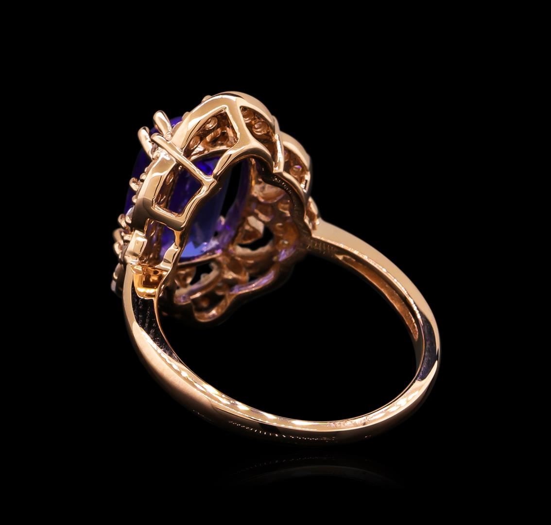 One electronically tested 14KT rose gold lady's cast fashion ring with a scalloped halo with a bright polish finish. The featured lady's ring has a shank measuring 1.90 millimeters wide. Identified with markings of "K14". Condition is new, good workmanship. Containing: One prong set rectangular cushion modified brilliant cut natural tanzanite, measuring 11.33 x 7.65 x 5.34mm, 5%. bulge factor, approximate weight of 3.83ct., clarity is eye clean, type I, medium dark, strong, violetish blue color, (GIA vB 6/5), cut is very good. Transmitting light with no distortion, transparent. Colored gemstones are presumed to have been subjected to commonly used enhancement processes. Graded in the setting. Forty-Four prong set round brilliant cut diamonds, measuring 1.60 - 1.40 x 0.90mm (depth est.) approximate total weight of 44 Stones = 0.55ct. Graded in the setting. Clarity: SI-1 to I-1. Color: G - I. Cut Good. Total Weight of Colored Stones 3.83ct. Total Weight of Diamonds 0.55ct. Total Weight of Ring 5.40gm. GAS Appraised at $8,890.00.