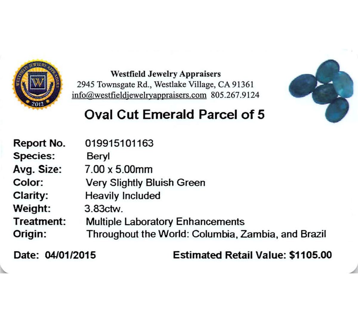 Five oval mixed cut natural emeralds exact total weight 3.83ct., clarity is heavily included, type III, medium dark, very slightly grayish, very slightly bluish green color, (GIA vslbG 6/3), cut is good. Westfield Appraised at $1,105.00.