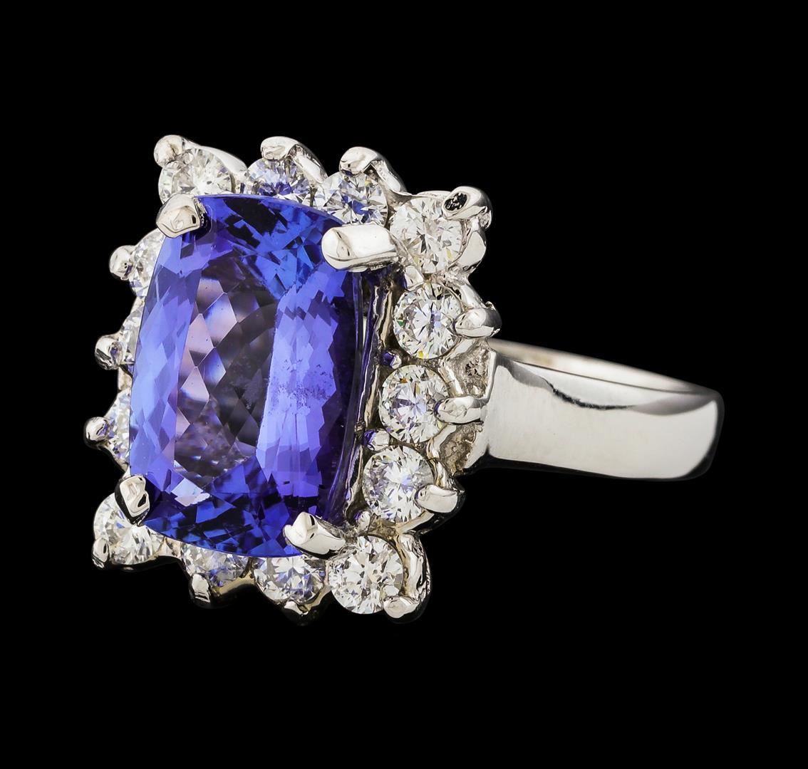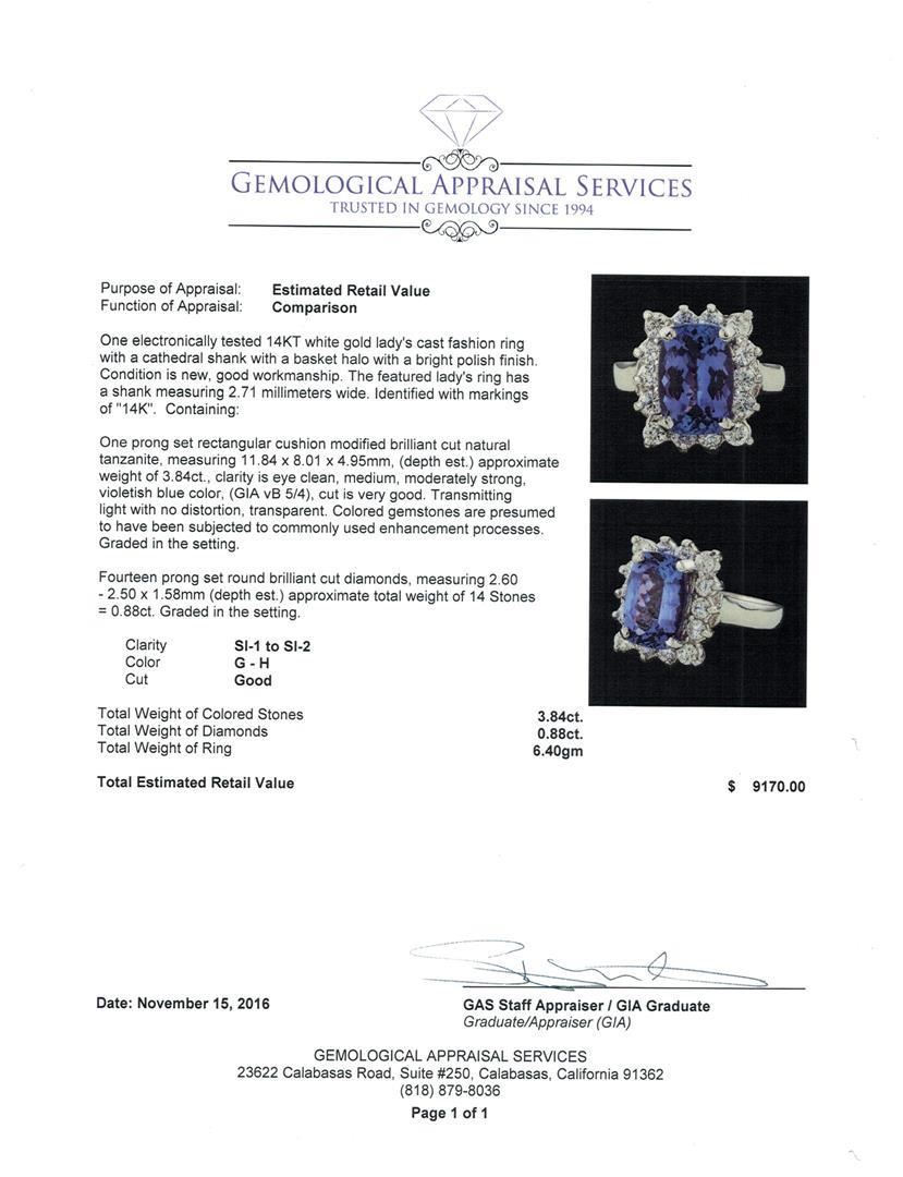 One electronically tested 14KT white gold lady's cast fashion ring with a cathedral shank with a basket halo with a bright polish finish. The featured lady's ring has a shank measuring 2.71 millimeters wide. Identified with markings of '14K'. Condition is new, good workmanship. Containing: One prong set rectangular cushion modified brilliant cut natural tanzanite, measuring 11.84 x 8.01 x 4.95mm, (depth est.) approximate weight of 3.84ct., clarity is eye clean, medium, moderately strong, violetish blue color, (GIA vB 5/4), cut is very good. Transmitting light with no distortion, transparent. Colored gemstones are presumed to have been subjected to commonly used enhancement processes. Graded in the setting. Fourteen prong set round brilliant cut diamonds, measuring 2.60 - 2.50 x 1.58mm (depth est.) approximate total weight of 14 Stones = 0.88ct. Graded in the setting. Clarity SI-1 to SI-2. Color: G - H Cut Good. Total Weight of Colored Stones 3.84ct.. Total Weight of Diamonds 0.88ct.. Total Weight of Ring 6.40gm. GAS Appraised.