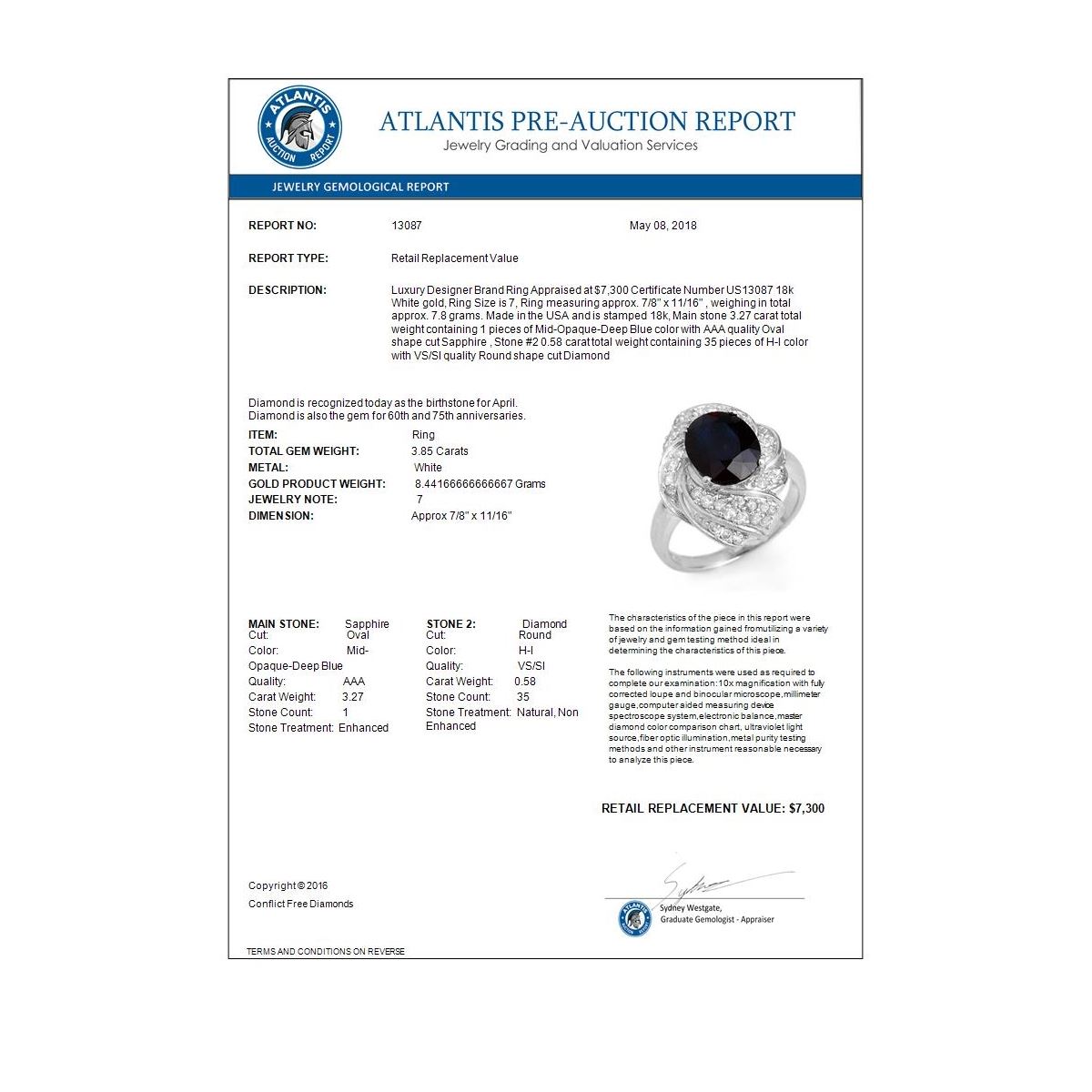 REF-102W2F -13087 ---- 3.85 CTW Blue Sapphire & Diamond Ring 18K White Gold ---- Luxury Designer Brand Ring Appraised at $7,300 Certificate Number US13087 18k White gold, Ring Size is 7, Ring measuring approx. 7/8" x 11/16" , weighing in total approx. 7.8 grams. Made in the USA and is stamped 18k, Main stone 3.27 carat total weight containing 1 pieces of Mid-Opaque-Deep Blue color with AAA quality Oval shape cut Sapphire , Stone #2 0.58 carat total weight containing 35 pieces of H-I color with VS/SI quality Round shape cut Diamond