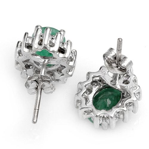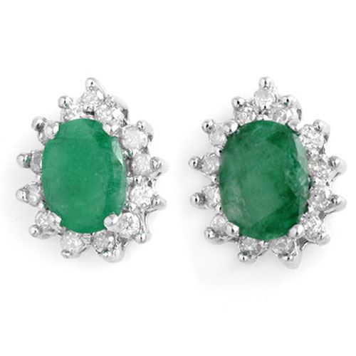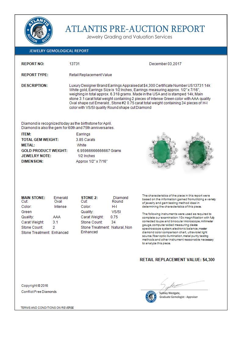 REF-65Y3K -13731 ---- 3.85 CTW Emerald & Diamond Earrings 14K White Gold ---- Luxury Designer Brand Earrings Appraised at $4,300 Certificate Number US13731 14k White gold, Earrings Size is 1/2 Inches, Earrings measuring approx. 1/2" x 7/16", weighing in total approx. 6.318 grams. Made in the USA and is stamped 14k, Main stone 3.1 carat total weight containing 2 pieces of Intense Green color with AAA quality Oval shape cut Emerald , Stone #2 0.75 carat total weight containing 34 pieces of H-I color with VS/SI quality Round shape cut Diamond
