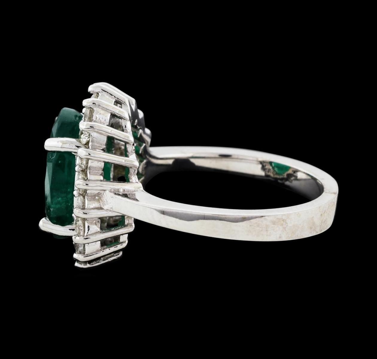 One electronically tested 14KT white gold lady's cast fashion ring with a basket halo with a bright polish finish. The featured lady's ring has a shank measuring 2.70 millimeters wide. Identified with markings of '14K'. Condition is new, good workmanship. Containing: One prong set oval modified mixed cut natural emerald, measuring 11.40 x 8.98 x 5.27mm, (depth est.) 15%. bulge factor, approximate weight of 3.85ct., clarity is heavily included, medium dark, moderately strong, green color, (GIA G 6/4), cut is good. Transmitting light somewhat diffusely, semi-transparent to translucent. Indications of oil residue. Naturally occurring internal & external characteristics are present. Colored gemstones are presumed to have been subjected to commonly used enhancement processes. Graded in the setting. Eighteen prong set round brilliant cut diamonds, measuring 2.00 - 1.95 x 1.23mm (depth est.) approximate total weight of 18 Stones = 0.55ct. Graded in the setting. Clarity SI-1 to SI-2. Color: H - I Cut Good. Total Weight of Colored Stones 3.85ct.. Total Weight of Diamonds 0.55ct.. Total Weight of Ring 6.40gm. GAS Appraised.