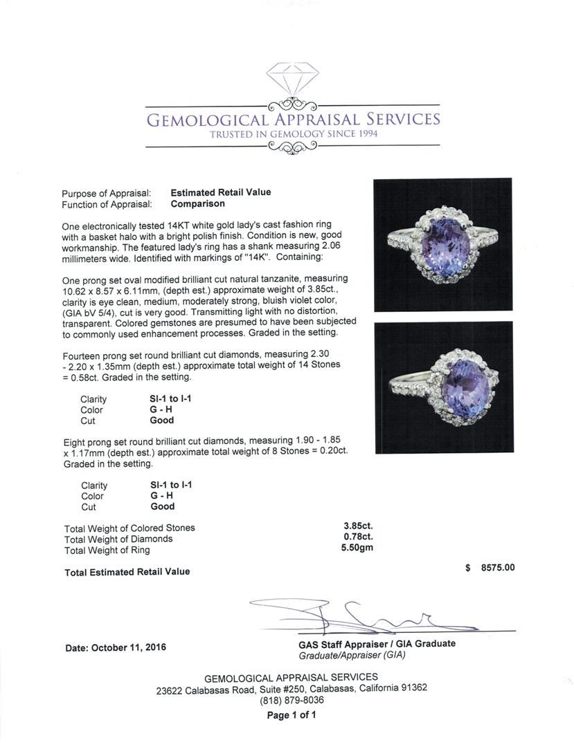 One electronically tested 14KT white gold lady's cast fashion ring with a basket halo with a bright polish finish. The featured lady's ring has a shank measuring 2.06 millimeters wide. Identified with markings of '14K'. Condition is new, good workmanship. Containing: One prong set oval modified brilliant cut natural tanzanite, measuring 10.62 x 8.57 x 6.11mm, (depth est.) approximate weight of 3.85ct., clarity is eye clean, medium, moderately strong, bluish violet color, (GIA bV 5/4), cut is very good. Transmitting light with no distortion, transparent. Colored gemstones are presumed to have been subjected to commonly used enhancement processes. Graded in the setting. Fourteen prong set round brilliant cut diamonds, measuring 2.30 - 2.20 x 1.35mm (depth est.) approximate total weight of 14 Stones = 0.58ct. Graded in the setting. Clarity SI-1 to I-1. Color: G - H Cut Good Eight prong set round brilliant cut diamonds, measuring 1.90 - 1.85 x 1.17mm (depth est.) approximate total weight of 8 Stones = 0.20ct. Graded in the setting. Clarity SI-1 to I-1. Color: G - H Cut Good. Total Weight of Colored Stones 3.85ct.. Total Weight of Diamonds 0.78ct.. Total Weight of Ring 5.50gm. GAS Appraised at $8,575.00.