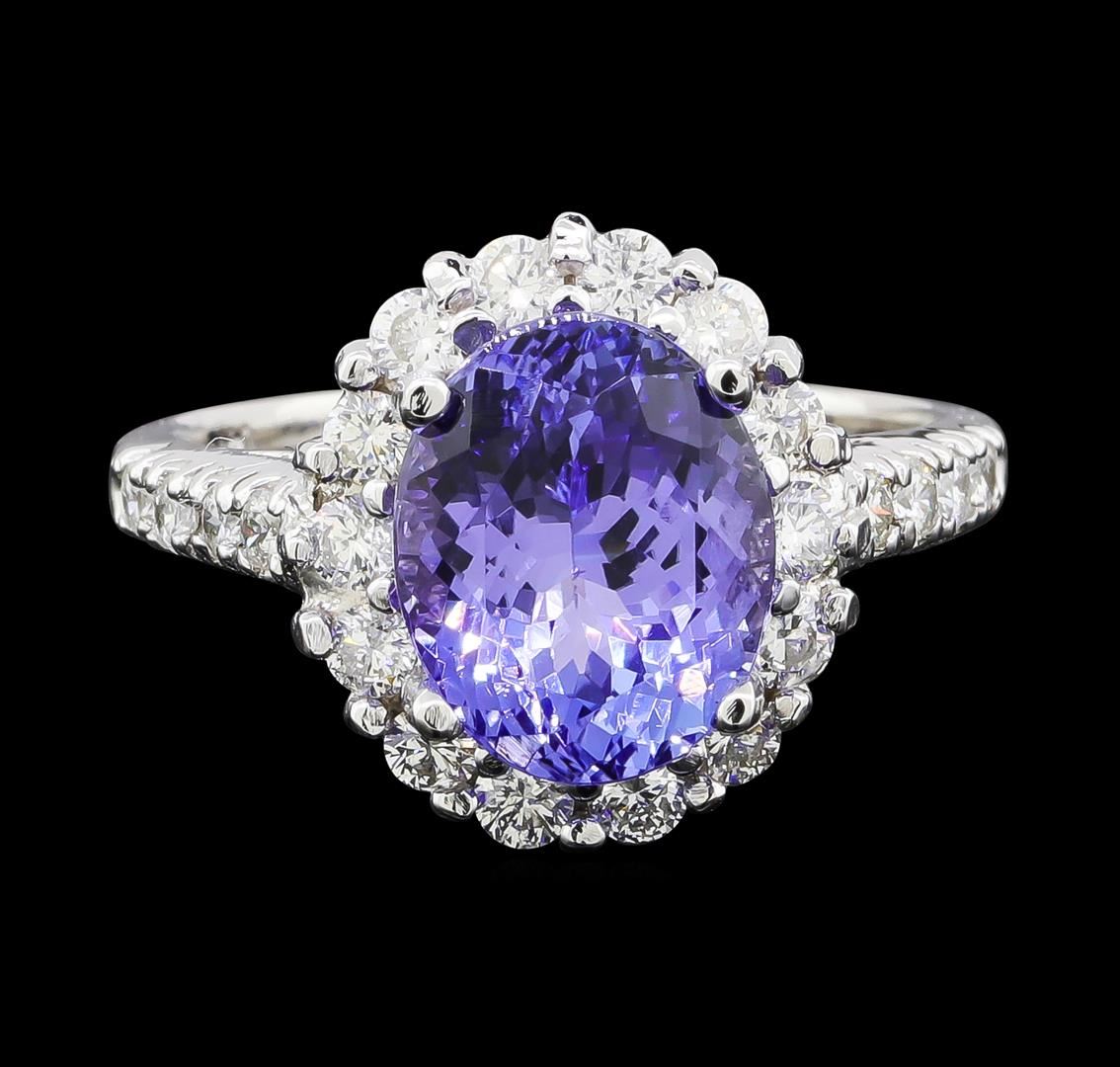 One electronically tested 14KT white gold lady's cast fashion ring with a basket halo with a bright polish finish. The featured lady's ring has a shank measuring 2.06 millimeters wide. Identified with markings of '14K'. Condition is new, good workmanship. Containing: One prong set oval modified brilliant cut natural tanzanite, measuring 10.62 x 8.57 x 6.11mm, (depth est.) approximate weight of 3.85ct., clarity is eye clean, medium, moderately strong, bluish violet color, (GIA bV 5/4), cut is very good. Transmitting light with no distortion, transparent. Colored gemstones are presumed to have been subjected to commonly used enhancement processes. Graded in the setting. Fourteen prong set round brilliant cut diamonds, measuring 2.30 - 2.20 x 1.35mm (depth est.) approximate total weight of 14 Stones = 0.58ct. Graded in the setting. Clarity SI-1 to I-1. Color: G - H Cut Good Eight prong set round brilliant cut diamonds, measuring 1.90 - 1.85 x 1.17mm (depth est.) approximate total weight of 8 Stones = 0.20ct. Graded in the setting. Clarity SI-1 to I-1. Color: G - H Cut Good. Total Weight of Colored Stones 3.85ct.. Total Weight of Diamonds 0.78ct.. Total Weight of Ring 5.50gm. GAS Appraised at $8,575.00.