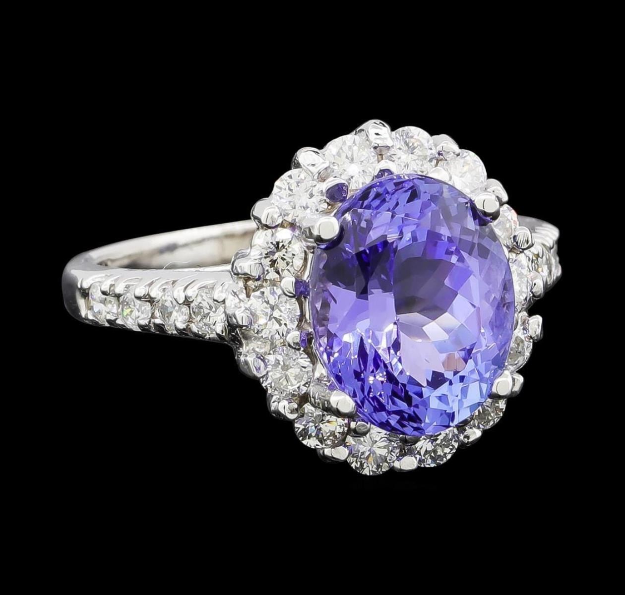 One electronically tested 14KT white gold lady's cast fashion ring with a basket halo with a bright polish finish. The featured lady's ring has a shank measuring 2.06 millimeters wide. Identified with markings of '14K'. Condition is new, good workmanship. Containing: One prong set oval modified brilliant cut natural tanzanite, measuring 10.62 x 8.57 x 6.11mm, (depth est.) approximate weight of 3.85ct., clarity is eye clean, medium, moderately strong, bluish violet color, (GIA bV 5/4), cut is very good. Transmitting light with no distortion, transparent. Colored gemstones are presumed to have been subjected to commonly used enhancement processes. Graded in the setting. Fourteen prong set round brilliant cut diamonds, measuring 2.30 - 2.20 x 1.35mm (depth est.) approximate total weight of 14 Stones = 0.58ct. Graded in the setting. Clarity SI-1 to I-1. Color: G - H Cut Good Eight prong set round brilliant cut diamonds, measuring 1.90 - 1.85 x 1.17mm (depth est.) approximate total weight of 8 Stones = 0.20ct. Graded in the setting. Clarity SI-1 to I-1. Color: G - H Cut Good. Total Weight of Colored Stones 3.85ct.. Total Weight of Diamonds 0.78ct.. Total Weight of Ring 5.50gm. GAS Appraised.