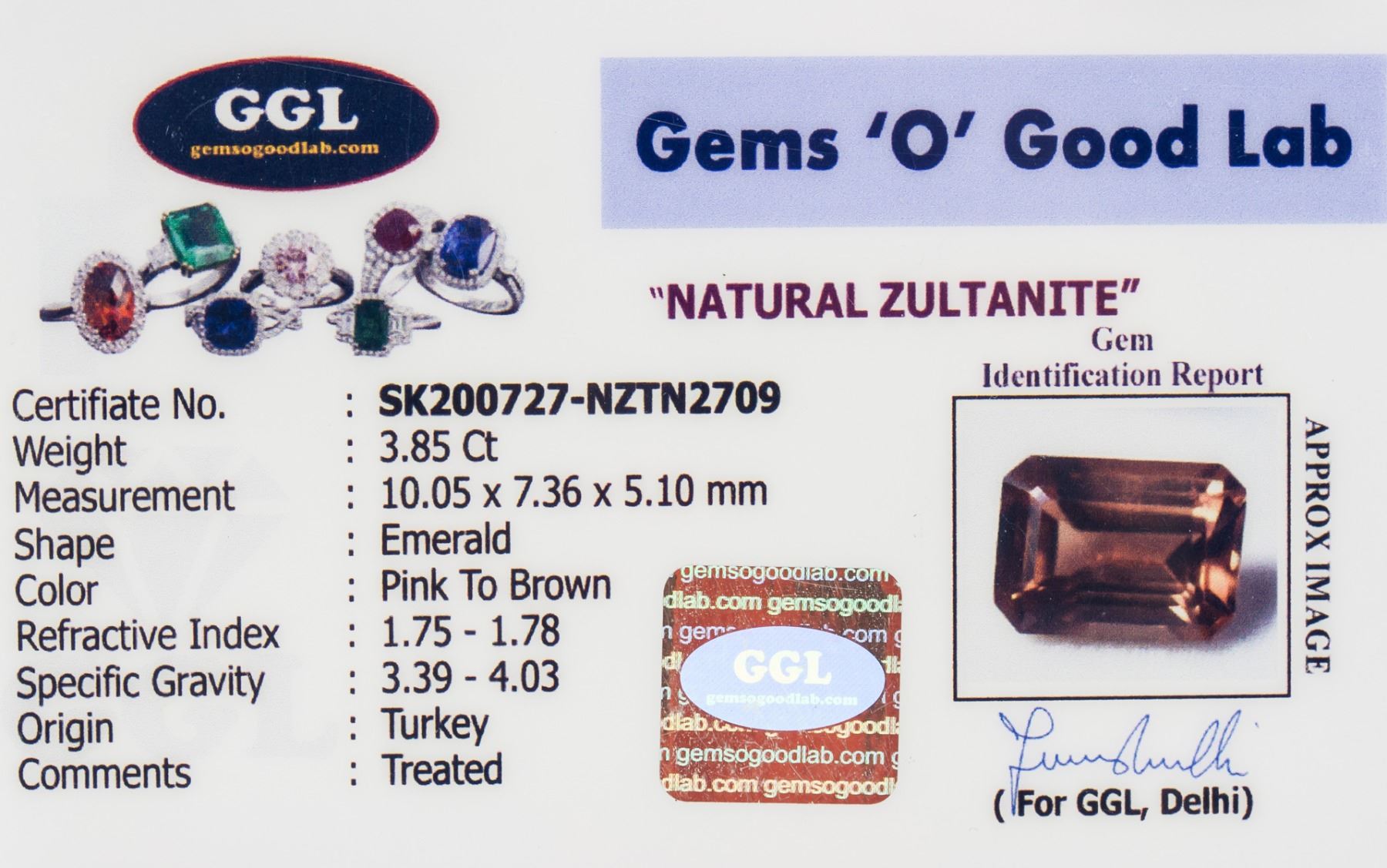 One (1) 3.85 ct emerald cut pink to brown natural zultanite. Origin: Turkey. Accompanied with GGL certificate. 10.05 x 7.36 x 5.10 mm.