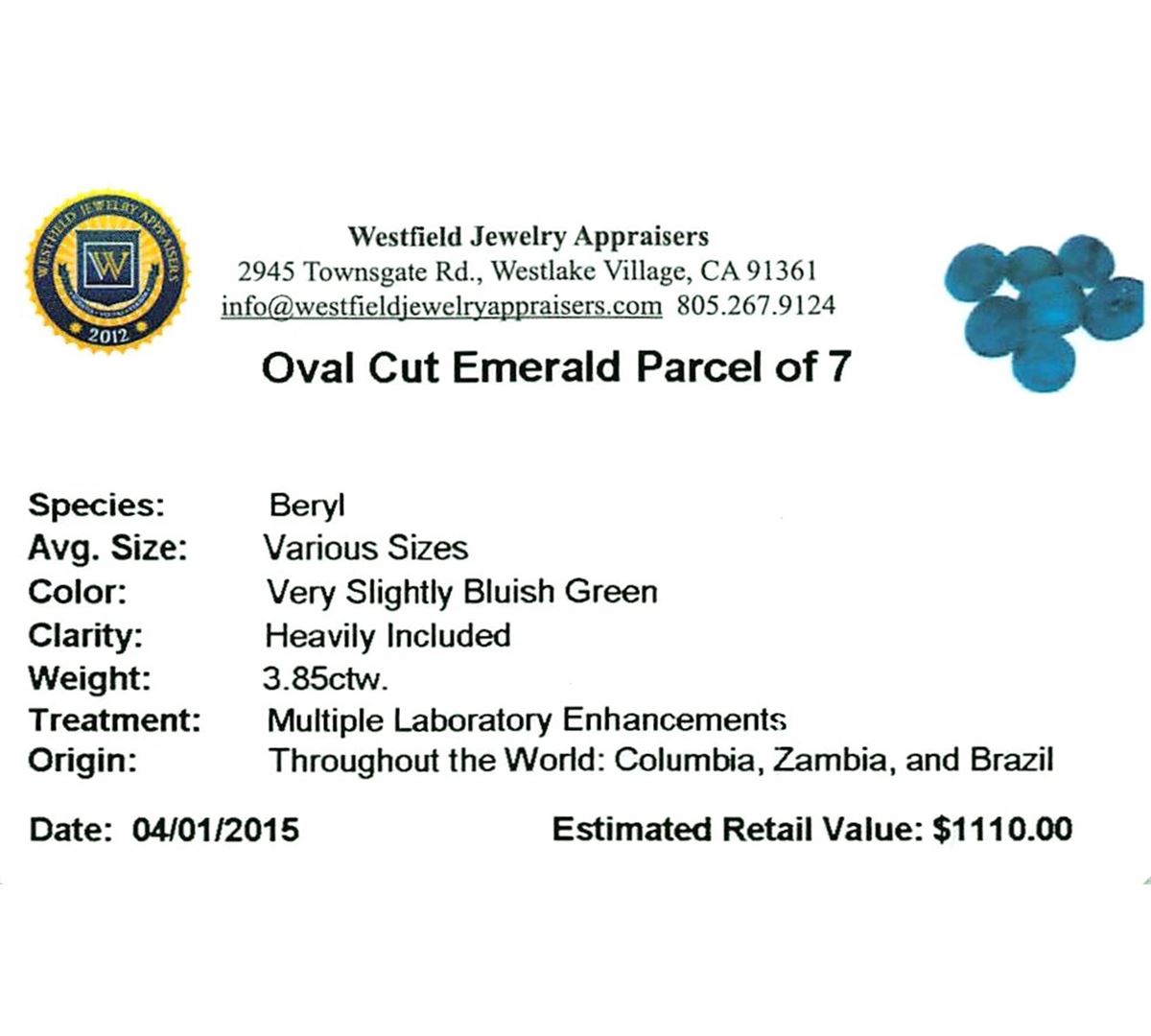 Seven oval mixed cut natural emeralds exact total weight 3.85ct., clarity is heavily included, type III, medium dark, very slightly grayish, very slightly bluish green color, (GIA vslbG 6/3), cut is good. UGS Appraised at $1,110.00.