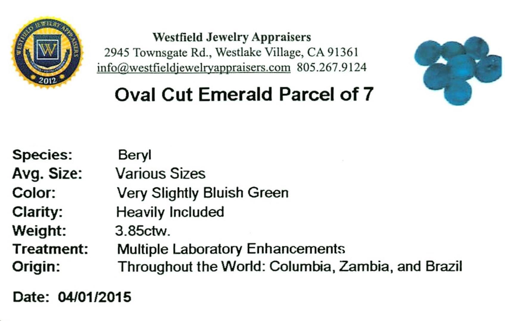 Seven oval mixed cut natural emeralds exact total weight 3.85ct., clarity is heavily included, type III, medium dark, very slightly grayish, very slightly bluish green color, (GIA vslbG 6/3), cut is good. UGS Appraised.