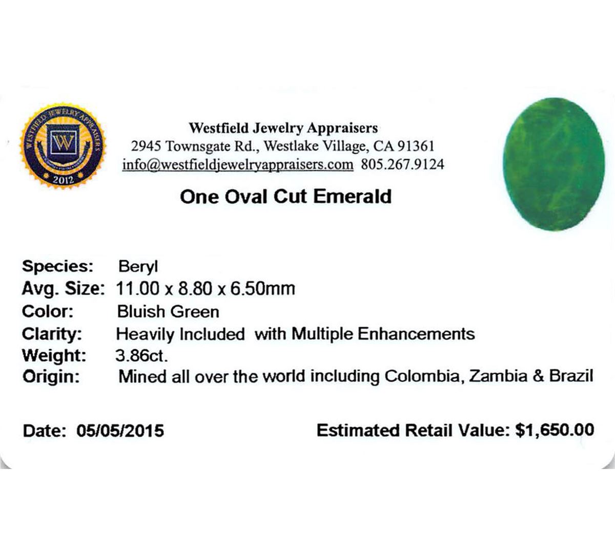 One oval mixed cut natural emerald, measuring 11.00 x 8.80 x 6.50mm, exact weight 3.86ct., clarity is heavily included, type III, dark, very slightly grayish, bluish green color, (GIA bG 7/3), cut is good. Indications of multiple laboratory enhancements, including high temperature heat treatment. Westfield Appraised at $1,650.00.