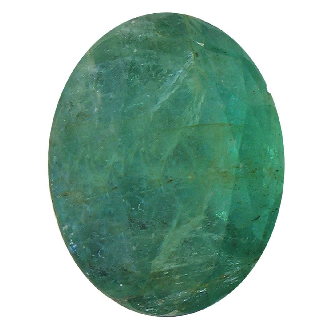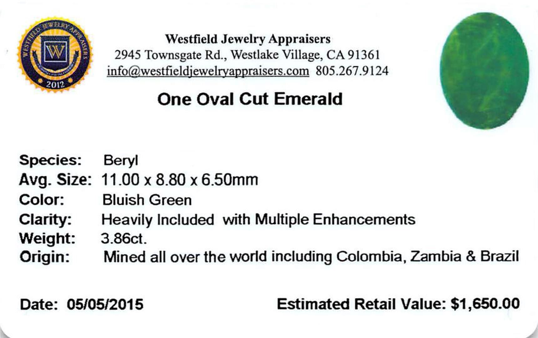 One oval mixed cut natural emerald, measuring 11.00 x 8.80 x 6.50mm, exact weight 3.86ct., clarity is heavily included, type III, dark, very slightly grayish, bluish green color, (GIA bG 7/3), cut is good. Indications of multiple laboratory enhancements, including high temperature heat treatment. Westfield Appraised.