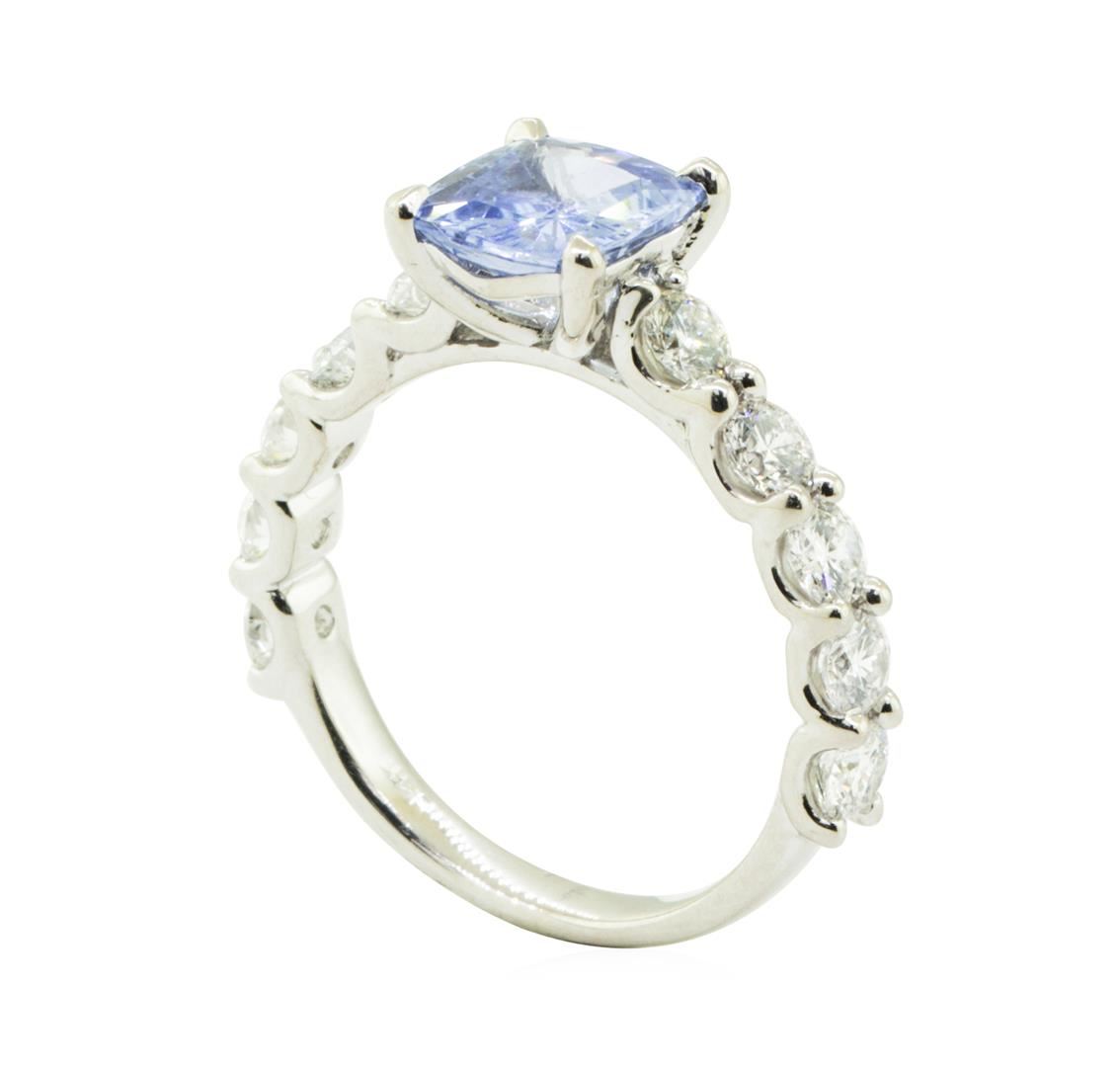 One electronically tested 14KT white gold lady's cast fashion straight line ring with a cathedral shank with a bright polish finish. The featured lady's ring has a shank measuring 2.75 millimeters in width. Identified with markings of '14K'. Condition is like new, good workmanship. Containing: One prong set rectangular cushion modified brilliant cut natural blue sapphire, measuring 8.38 x 7.45 x 3.90mm, (depth est.) 5%. bulge factor, approximate weight of 2.40ct., clarity is slightly included, light, very slightly grayish, blue color, (GIA B 3/3), cut is good. Transmitting light with a minimum of distortion, transparent. Colored gemstones are presumed to have been subjected to commonly used enhancement processes. Graded in the setting. Ten prong set round brilliant cut diamonds, measuring 3.46 - 3.32 x 2.07mm (depth est.) approximate total weight of 10 Stones = 1.46ct. Graded in the setting. Color H - I Clarity SI-1 to SI-2 Cut Good. Total Weight of Colored Stones 2.40ct.. Total Weight of Diamonds 1.46ct.. Total Weight of Ring 4.60gm GAS Appraised at $5550.00. GAS Appraised.