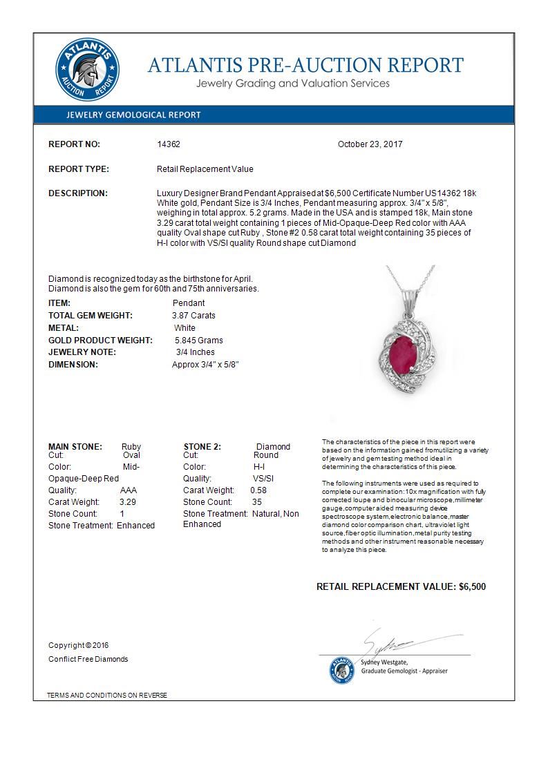 14362 - REF-90N9A ---- 3.87 CTW Ruby & Diamond Pendant 18K White Gold ---- Luxury Designer Brand Pendant Appraised at $6,500 Certificate Number US14362 18k White gold, Pendant Size is 3/4 Inches, Pendant measuring approx. 3/4" x 5/8", weighing in total approx. 5.2 grams. Made in the USA and is stamped 18k, Main stone 3.29 carat total weight containing 1 pieces of Mid-Opaque-Deep Red color with AAA quality Oval shape cut Ruby , Stone #2 0.58 carat total weight containing 35 pieces of H-I color with VS/SI quality Round shape cut Diamond