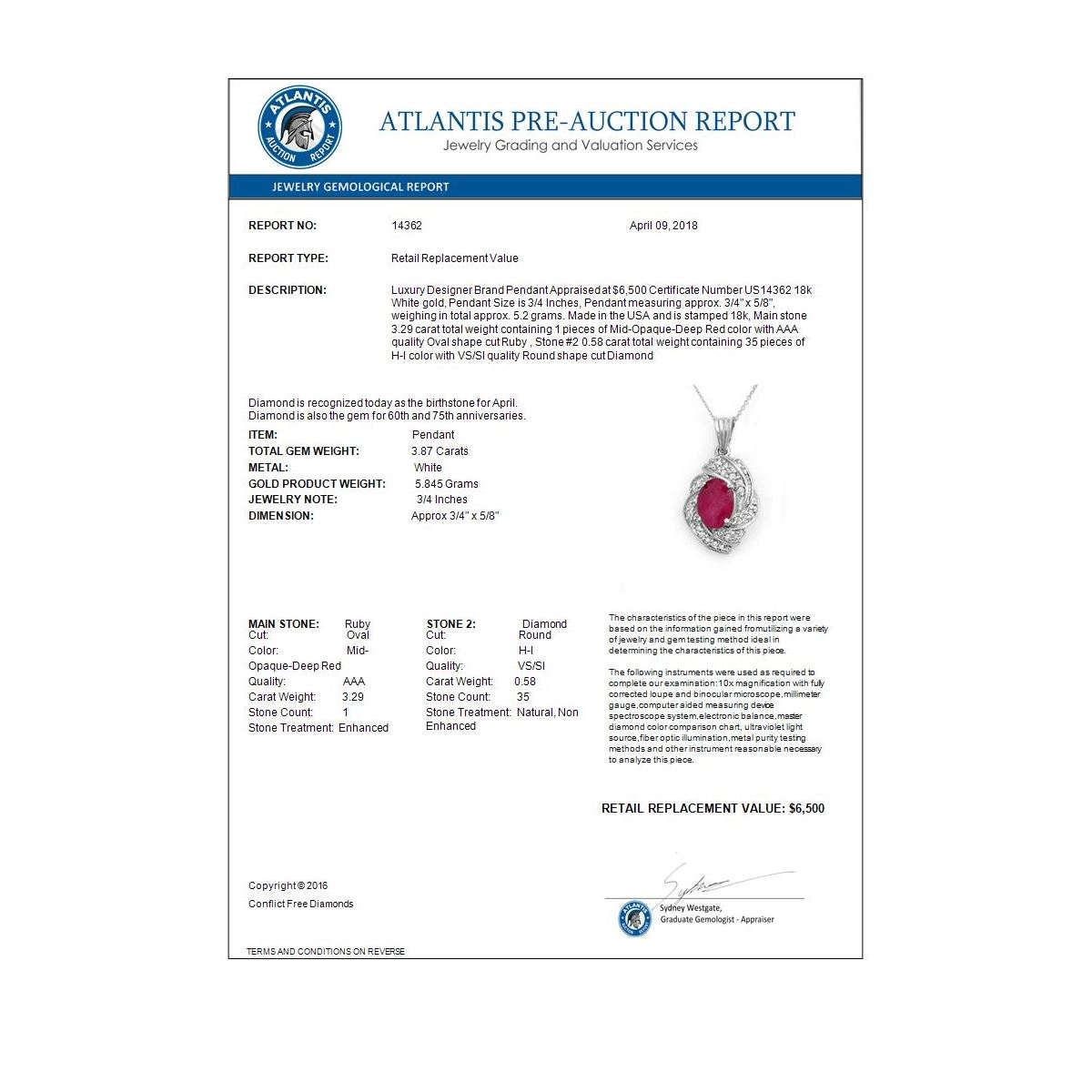 REF-90X9T -14362 ---- 3.87 CTW Ruby & Diamond Pendant 18K White Gold ---- Luxury Designer Brand Pendant Appraised at $6,500 Certificate Number US14362 18k White gold, Pendant Size is 3/4 Inches, Pendant measuring approx. 3/4" x 5/8", weighing in total approx. 5.2 grams. Made in the USA and is stamped 18k, Main stone 3.29 carat total weight containing 1 pieces of Mid-Opaque-Deep Red color with AAA quality Oval shape cut Ruby , Stone #2 0.58 carat total weight containing 35 pieces of H-I color with VS/SI quality Round shape cut Diamond