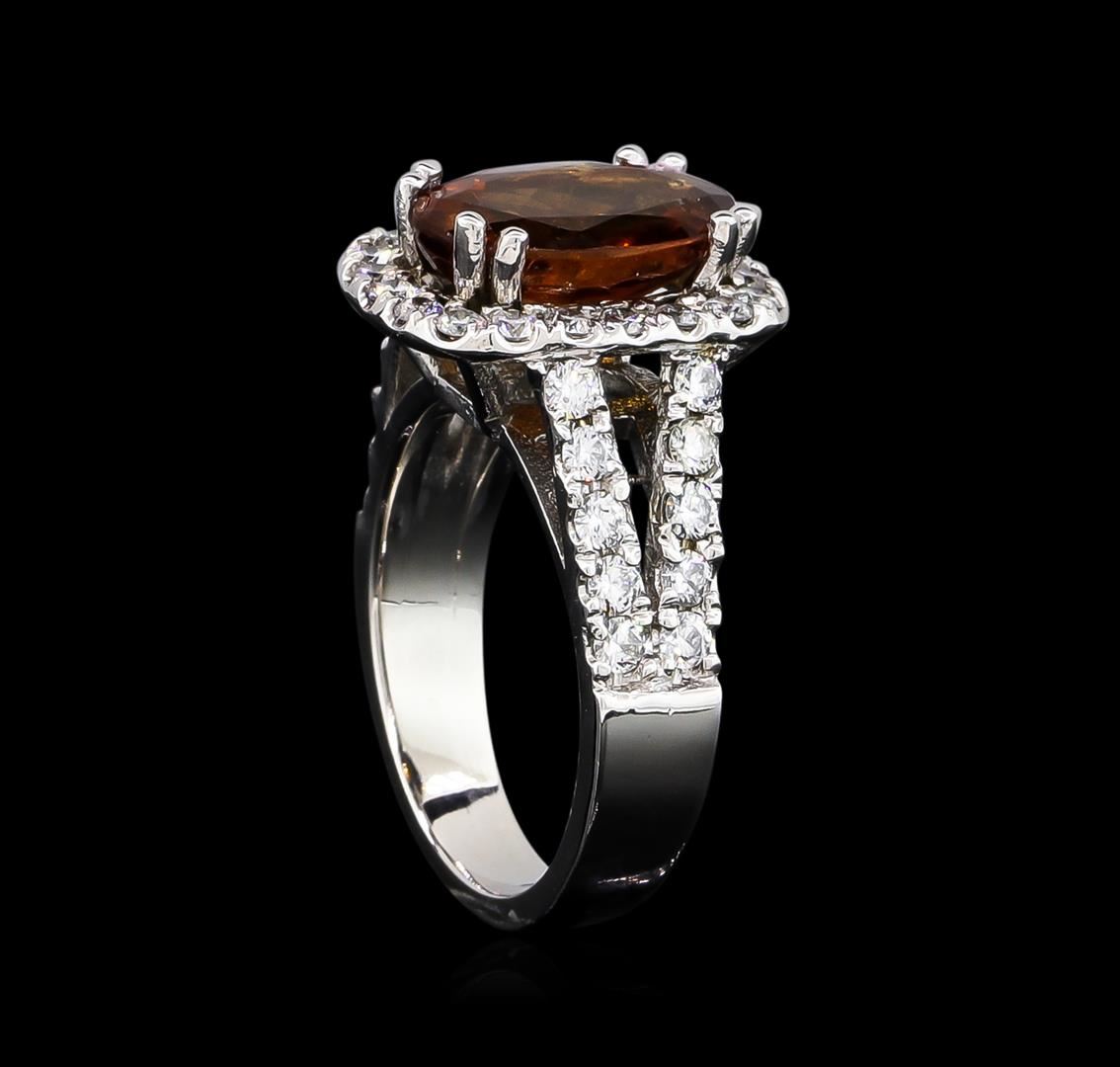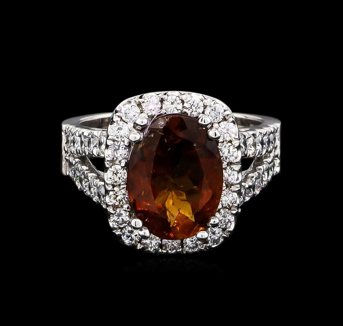 One electronically tested 14KT white gold lady's cast fashion ring with a split shank with a bright polish finish. The featured lady's ring has a shank measuring 3.90 millimeters wide. Identified with markings of "14K". Condition is new, good workmanship. Containing: One prong set oval modified brilliant cut natural golden tourmaline, measuring 12.04 x 8.98 x 5.27mm, 5%. bulge factor, approximate weight of 3.87ct., clarity is slightly included, type II, medium dark, moderately strong, yellowish orange color, (GIA yO 6/4), cut is good. Transmitting light with a minimum of distortion, transparent. Colored gemstones are presumed to have been subjected to commonly used enhancement processes. Graded in the setting. Twenty prong set round brilliant cut diamonds, measuring 2.10 - 2.00 x 1.27mm (depth est.) approximate total weight of 20 Stones = 0.66ct. Graded in the setting. Clarity: SI-1 to SI-2. Color: H - I. Cut Good Twenty prong set round brilliant cut diamonds, measuring 1.90 - 1.80 x 1.15mm (depth est.) approximate total weight of 20 Stones = 0.49ct. Graded in the setting. Clarity: VS-2 to SI-2. Color: H - I. Cut Very Good. Total Weight of Colored Stones 3.87ct. Total Weight of Diamonds 1.15ct. Total Weight of Ring 7.80gm. GAS Appraised at $7,365.00.