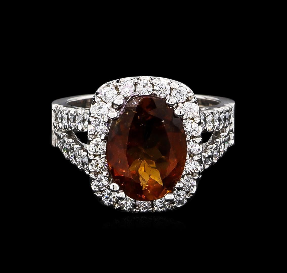 One electronically tested 14KT white gold lady's cast fashion ring with a split shank with a bright polish finish. The featured lady's ring has a shank measuring 3.90 millimeters wide. Identified with markings of "14K". Condition is new, good workmanship. Containing: One prong set oval modified brilliant cut natural golden tourmaline, measuring 12.04 x 8.98 x 5.27mm, 5%. bulge factor, approximate weight of 3.87ct., clarity is slightly included, type II, medium dark, moderately strong, yellowish orange color, (GIA yO 6/4), cut is good. Transmitting light with a minimum of distortion, transparent. Colored gemstones are presumed to have been subjected to commonly used enhancement processes. Graded in the setting. Twenty prong set round brilliant cut diamonds, measuring 2.10 - 2.00 x 1.27mm (depth est.) approximate total weight of 20 Stones = 0.66ct. Graded in the setting. Clarity: SI-1 to SI-2. Color: H - I. Cut Good Twenty prong set round brilliant cut diamonds, measuring 1.90 - 1.80 x 1.15mm (depth est.) approximate total weight of 20 Stones = 0.49ct. Graded in the setting. Clarity: VS-2 to SI-2. Color: H - I. Cut Very Good. Total Weight of Colored Stones 3.87ct. Total Weight of Diamonds 1.15ct. Total Weight of Ring 7.80gm. GAS Appraised.