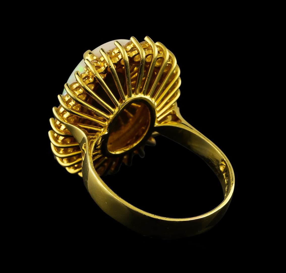 One electronically tested 18KT yellow gold ladies cast opal and diamond ring with a bright polish finish. The featured opal is set within a diamond floret supported by a ribbed under gallery, completed by a three millimeter wide band. Identified with markings of '750 18K'. Condition is good. Containing: One semi crystal opal that is cut in a oval shaped cabochon and is prong set, measuring 17.10 mm long x 12.10 mm wide, and 3.00 mm thick and the approximate weight is 3.87 carats. The opal has a bright, multicolor play of color (fire) in a flashfire pattern; a low dome; a good cut; slightly included; slight variation in base in its brightness and pattern; and is slightly directional. Graded in the setting. Twenty-Eight prong set round brilliant cut diamonds, measuring 1.80 - 1.80 x 1.08mm (depth est.) approximate total weight of 28 Stones = 0.65ct. The color grade reflects the range of color for this group. Graded in the setting. Clarity SI-2 to I-2. Color: H - K. Total Weight of Diamonds 0.65ct.. Total Weight of Opals 3.87ct.. Total Weight of Ring 7.83gm. AIG Appraised at $4,280.00.