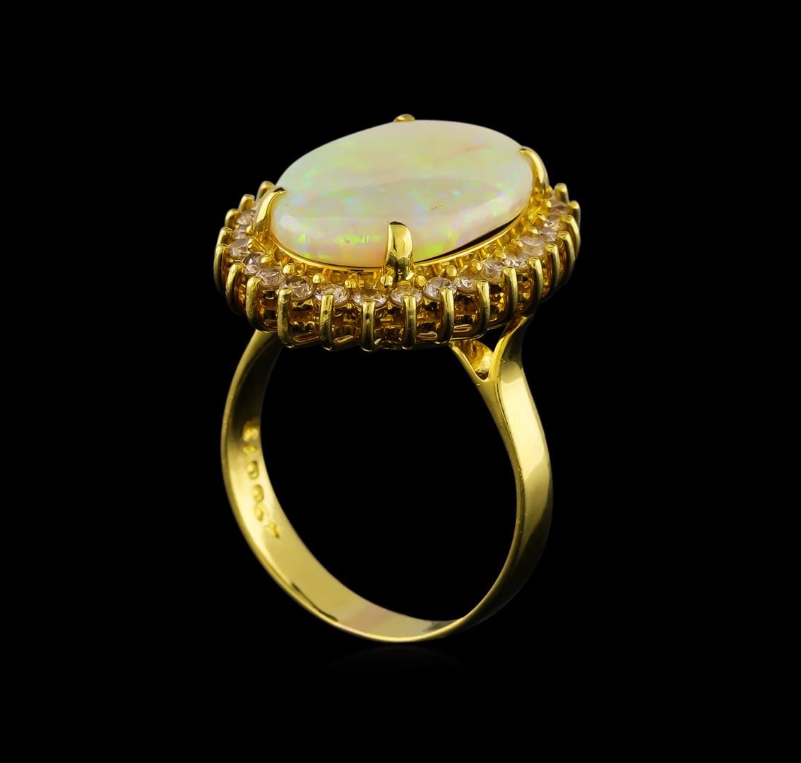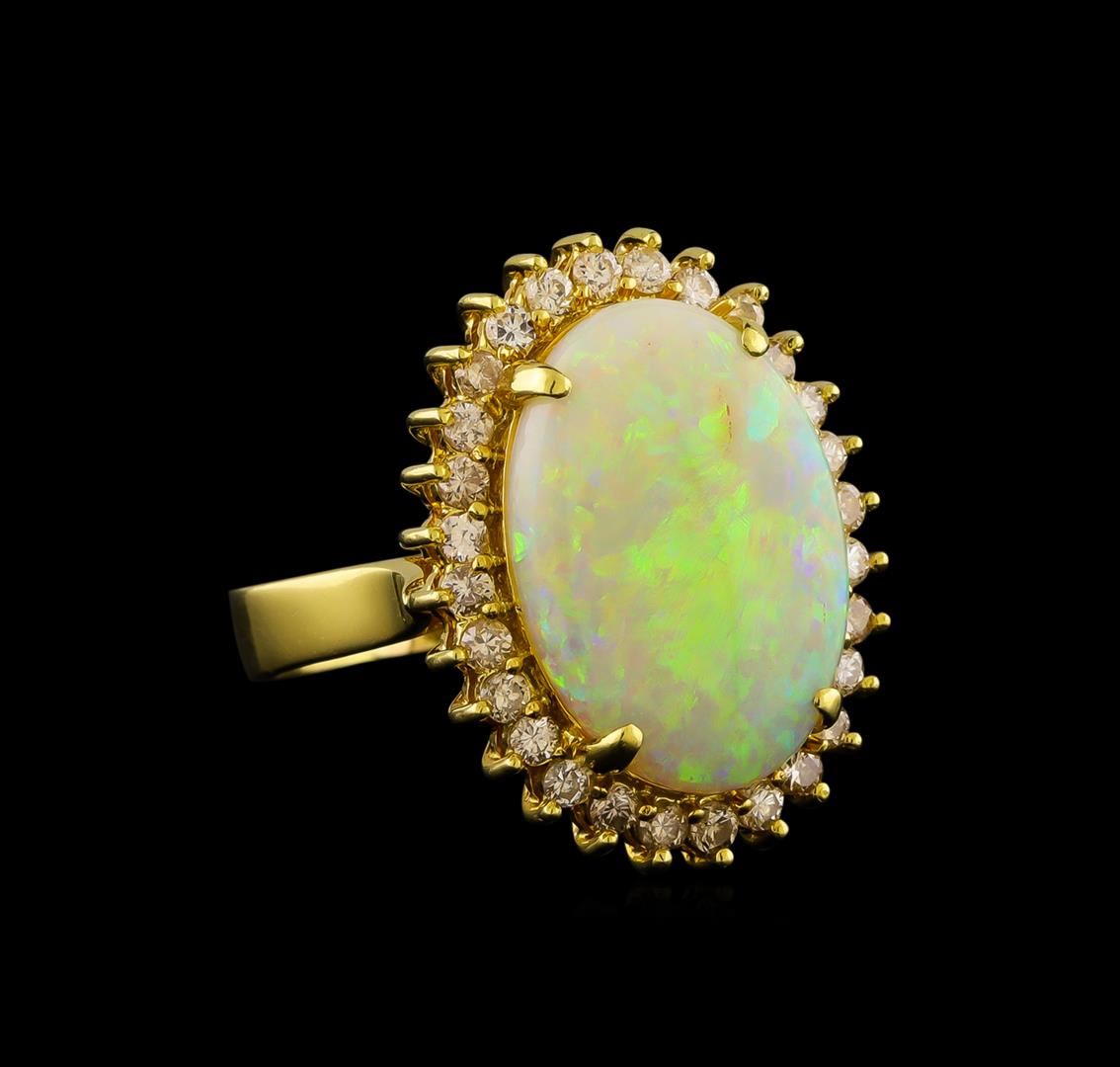 One electronically tested 18KT yellow gold ladies cast opal and diamond ring with a bright polish finish. The featured opal is set within a diamond floret supported by a ribbed under gallery, completed by a three millimeter wide band. Identified with markings of '750 18K'. Condition is good. Containing: One semi crystal opal that is cut in a oval shaped cabochon and is prong set, measuring 17.10 mm long x 12.10 mm wide, and 3.00 mm thick and the approximate weight is 3.87 carats. The opal has a bright, multicolor play of color (fire) in a flashfire pattern; a low dome; a good cut; slightly included; slight variation in base in its brightness and pattern; and is slightly directional. Graded in the setting. Twenty-Eight prong set round brilliant cut diamonds, measuring 1.80 - 1.80 x 1.08mm (depth est.) approximate total weight of 28 Stones = 0.65ct. The color grade reflects the range of color for this group. Graded in the setting. Clarity SI-2 to I-2. Color: H - K. Total Weight of Diamonds 0.65ct.. Total Weight of Opals 3.87ct.. Total Weight of Ring 7.83gm. AIG Appraised at $4,280.00.