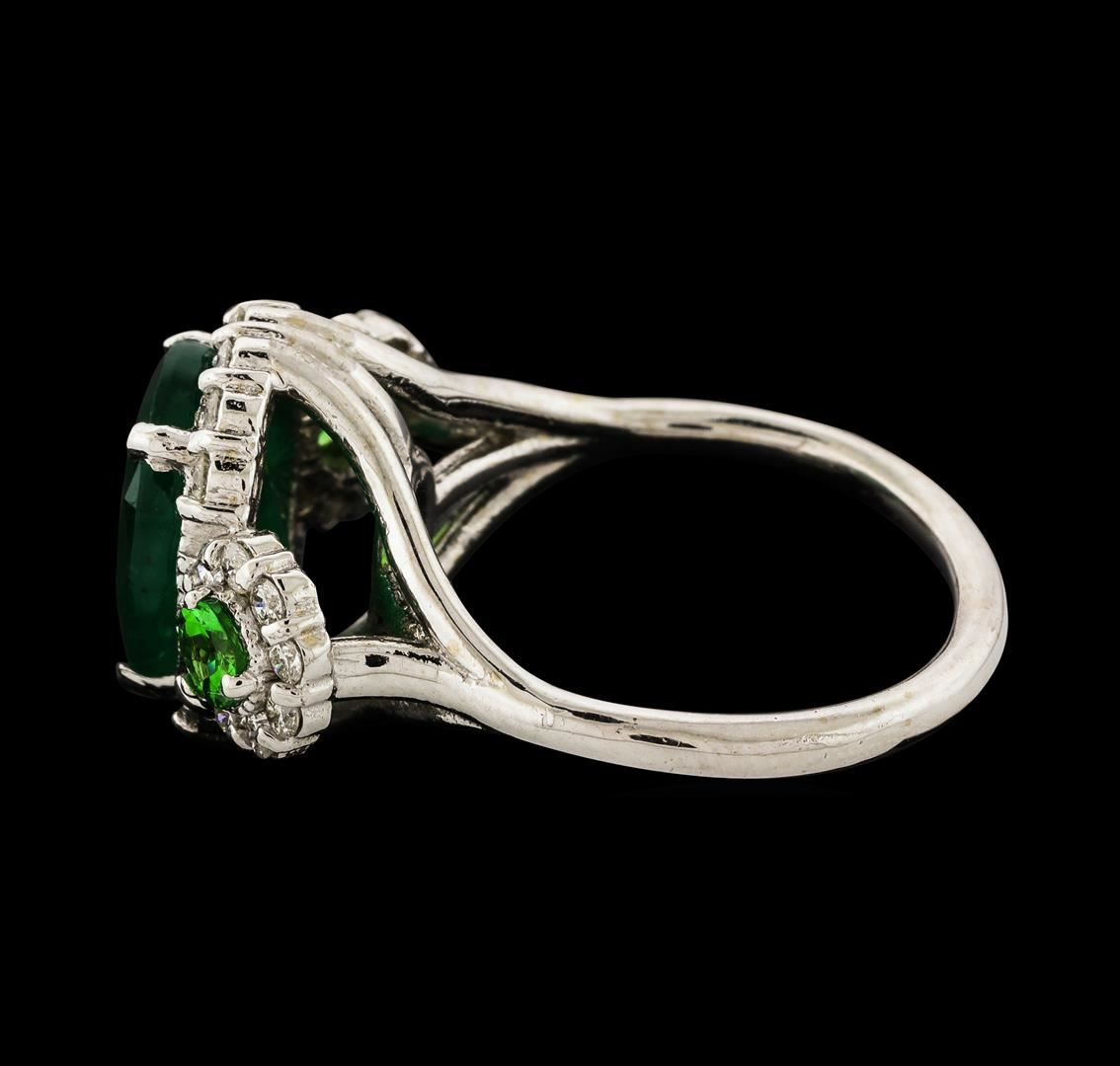 One electronically tested 14KT white gold lady's cast fashion ring with a three stone halo with a bright polish finish. The featured lady's ring has a shank measuring 1.89 millimeters wide. Identified with markings of '14K'. Condition is new, good workmanship. Containing: One prong set oval modified mixed cut natural emerald, measuring 11.32 x 8.96 x 5.18mm, (depth est.) 10%. bulge factor, approximate weight of 3.46ct., clarity is heavily included, medium dark, moderately strong, green color, (GIA G 6/4), cut is good. Transmitting light somewhat diffusely, semi-transparent to translucent. No indications of clarity enhancement. Indications of oil residue. Colored gemstones are presumed to have been subjected to commonly used enhancement processes. Graded in the setting. Two prong set round modified brilliant cut natural tsavorite garnets, measuring 3.60 - 3.50 x 2.31 mm, (depth est.) approximate total weight of 0.42ct., clarity is eye clean, medium, moderately strong, slightly yellowish green color, (GIA slyG 5/4), cut is good. Transmitting light with no distortion, transparent. Colored gemstones are presumed to have been subjected to commonly used enhancement processes. Graded in the setting. Thirty prong set round brilliant cut diamonds, measuring 1.70 - 1.60 x 1.02mm (depth est.) approximate total weight of 30 Stones = 0.52ct. Graded in the setting. Clarity SI-1 to SI-2. Color: G - H Cut Good. Total Weight of Colored Stones 3.88ct.. Total Weight of Diamonds 0.52ct.. Total Weight of Ring 6.40gm. GAS Appraised.