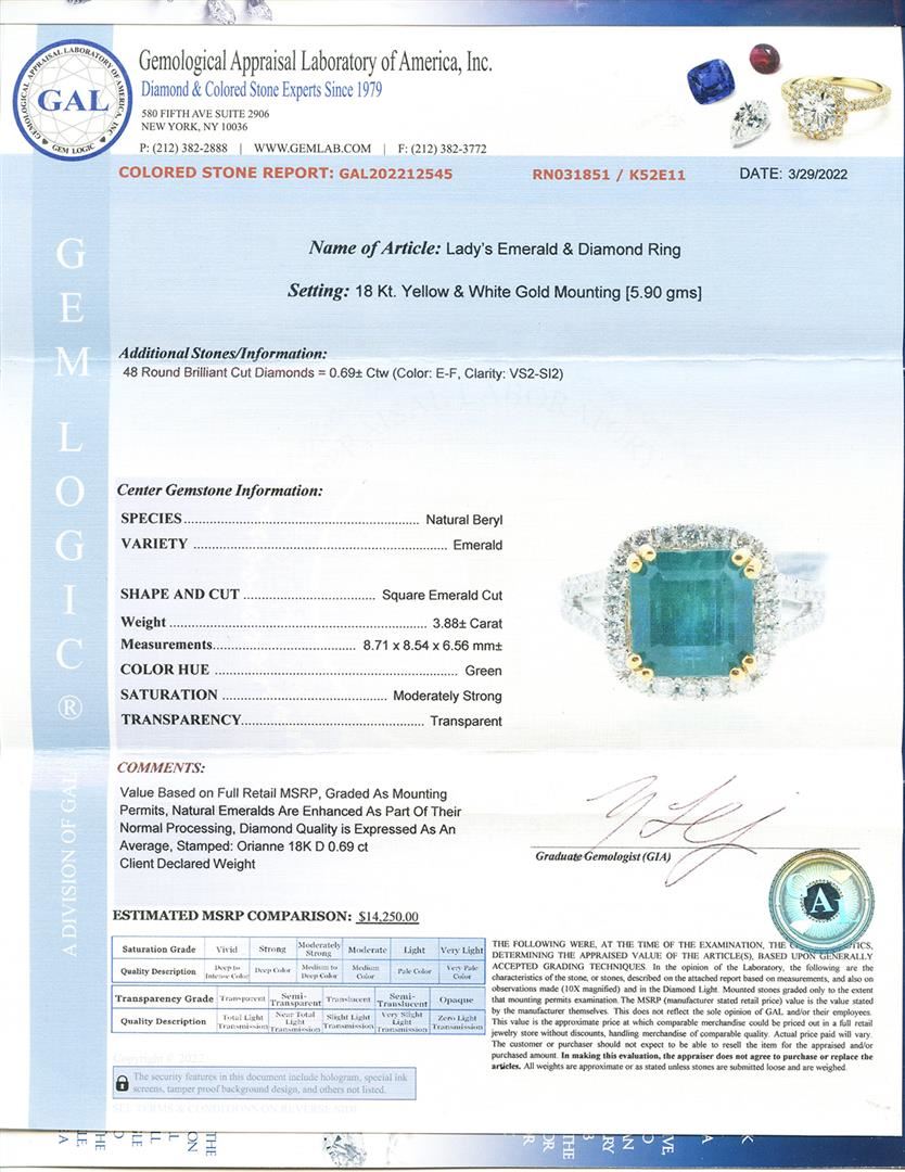 Name of Article: Lady's Emerald and Diamond Ring Setting: 18 Kt. Yellow and White Gold Mounting [5.90 gms] #Additional Stones/Information:# 48 Round Brilliant Cut Diamonds = 0.69 Ctw (Color: E-F, Clarity: VS2-SI2) #Center Gemstone Information:# SPECIES: N