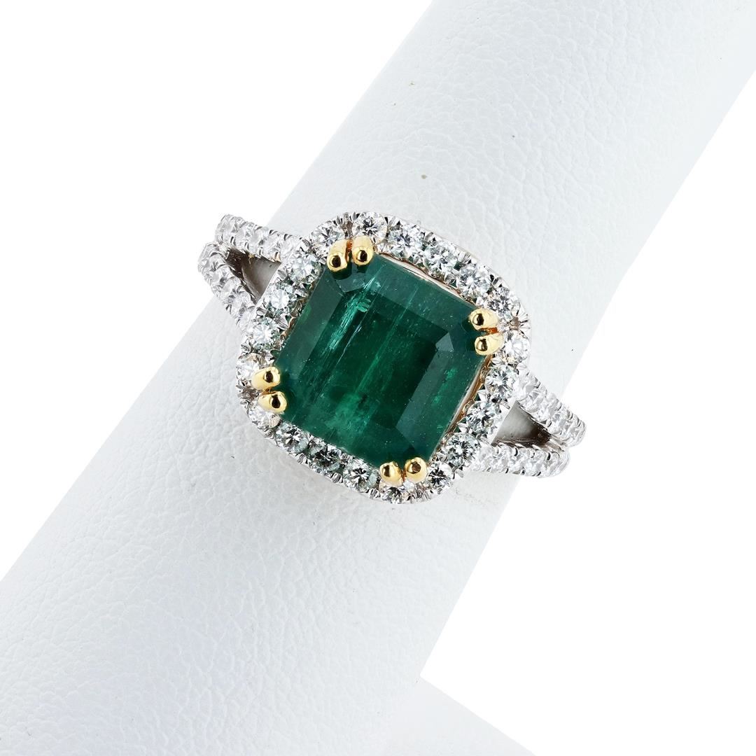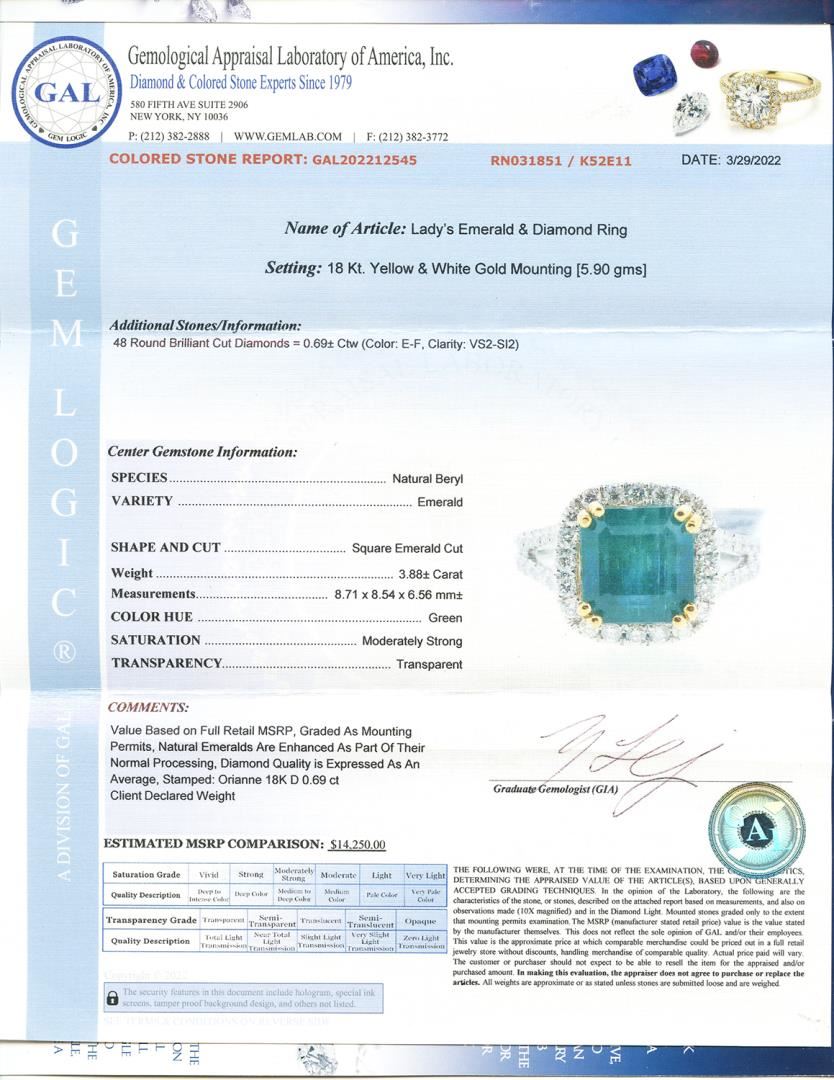 Name of Article: Lady's Emerald and Diamond Ring; Setting: 18 Kt. Yellow and White Gold Mounting [5.90 gms] #Additional Stones/Information:# 48 Round Brilliant Cut Diamonds = 0.69 Ctw (Color: E-F, Clarity: VS2-SI2) #Center Gemstone Information:# SPECIES: Natural Beryl; VARIETY: Emerald; SHAPE AND CUT: Square Emerald Cut; Weight: 3.88 Carat; Measurements: 8.71 x 8.54 x 6.58mm; COLOR HUE: Green; SATURATION: Moderately Strong; TRANSPARENCY: Transparent #Size: 7