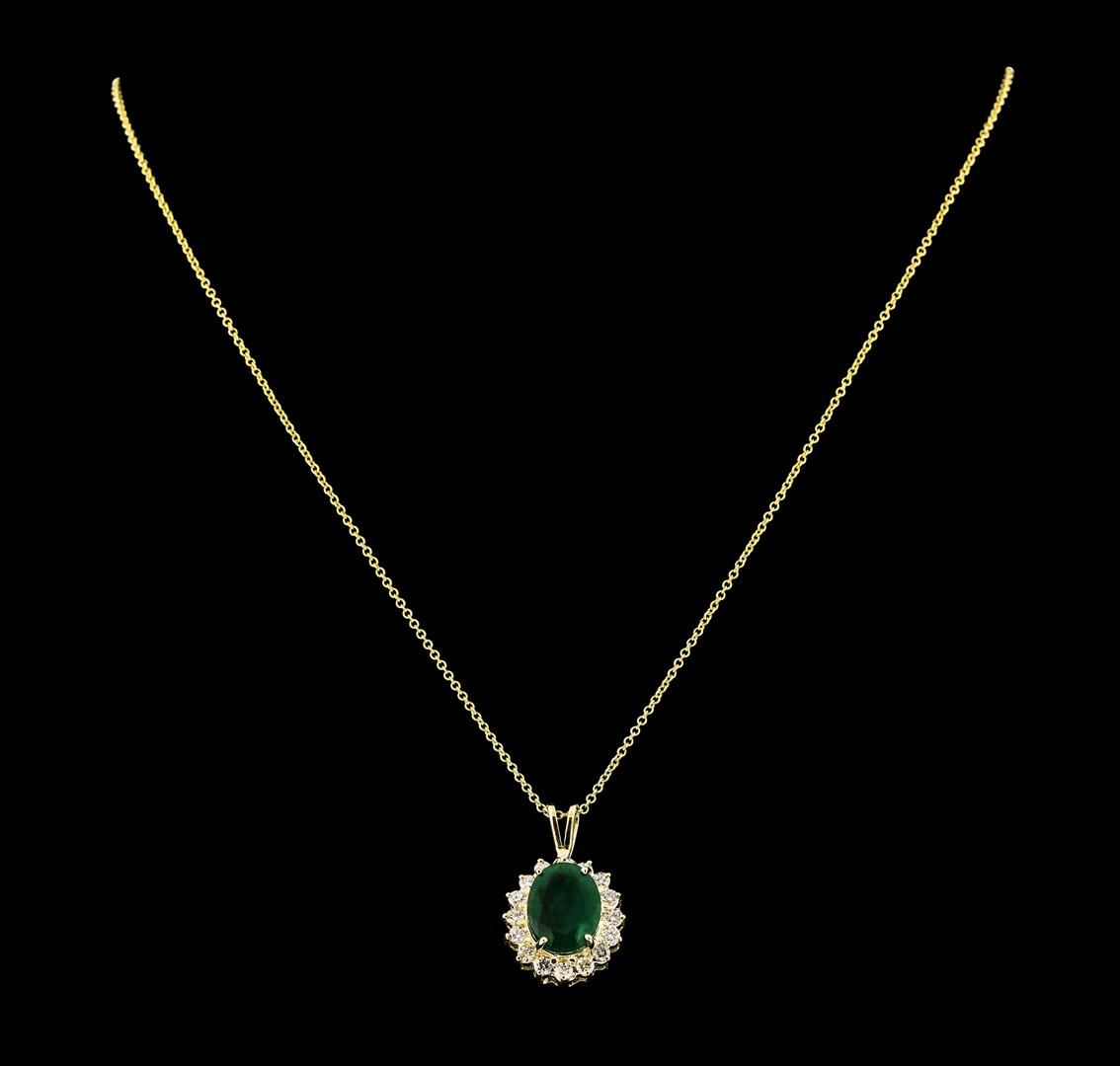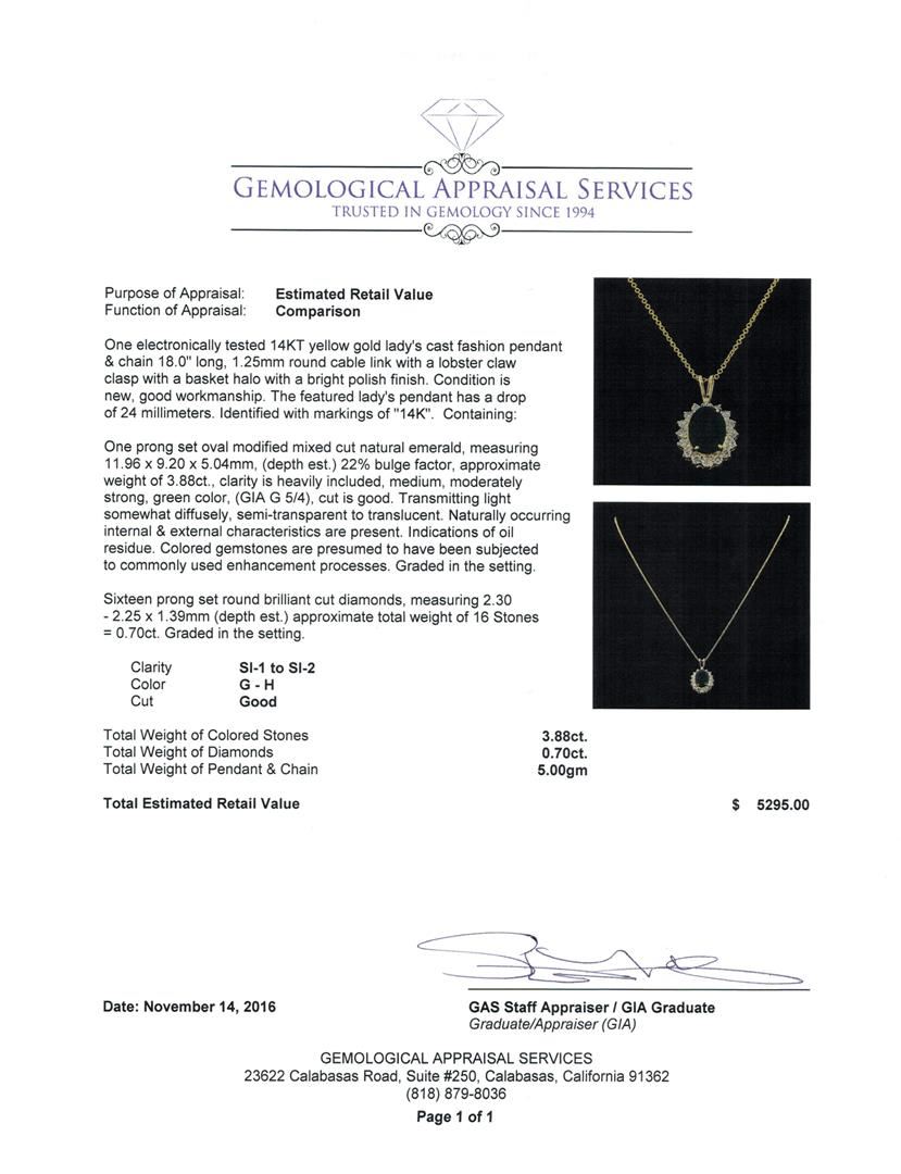 One electronically tested 14KT yellow gold lady's cast fashion pendant & chain 18.0' long, 1.25mm round cable link with a lobster claw clasp with a basket halo with a bright polish finish. The featured lady's pendant has a drop of 24 millimeters. Identified with markings of '14K'. Condition is new, good workmanship. Containing: One prong set oval modified mixed cut natural emerald, measuring 11.96 x 9.20 x 5.04mm, (depth est.) 22%. bulge factor, approximate weight of 3.88ct., clarity is heavily included, medium, moderately strong, green color, (GIA G 5/4), cut is good. Transmitting light somewhat diffusely, semi-transparent to translucent. Naturally occurring internal & external characteristics are present. Indications of oil residue. Colored gemstones are presumed to have been subjected to commonly used enhancement processes. Graded in the setting. Sixteen prong set round brilliant cut diamonds, measuring 2.30 - 2.25 x 1.39mm (depth est.) approximate total weight of 16 Stones = 0.70ct. Graded in the setting. Clarity SI-1 to SI-2. Color: G - H Cut Good. Total Weight of Colored Stones 3.88ct.. Total Weight of Diamonds 0.70ct.. Total Weight of Pendant & Chain 5.00gm GAS Appraised at $5,295.00.
