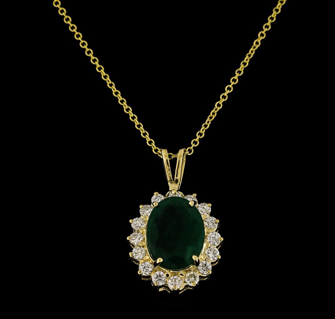 One electronically tested 14KT yellow gold lady's cast fashion pendant & chain 18.0' long, 1.25mm round cable link with a lobster claw clasp with a basket halo with a bright polish finish. The featured lady's pendant has a drop of 24 millimeters. Identified with markings of '14K'. Condition is new, good workmanship. Containing: One prong set oval modified mixed cut natural emerald, measuring 11.96 x 9.20 x 5.04mm, (depth est.) 22%. bulge factor, approximate weight of 3.88ct., clarity is heavily included, medium, moderately strong, green color, (GIA G 5/4), cut is good. Transmitting light somewhat diffusely, semi-transparent to translucent. Naturally occurring internal & external characteristics are present. Indications of oil residue. Colored gemstones are presumed to have been subjected to commonly used enhancement processes. Graded in the setting. Sixteen prong set round brilliant cut diamonds, measuring 2.30 - 2.25 x 1.39mm (depth est.) approximate total weight of 16 Stones = 0.70ct. Graded in the setting. Clarity SI-1 to SI-2. Color: G - H Cut Good. Total Weight of Colored Stones 3.88ct.. Total Weight of Diamonds 0.70ct.. Total Weight of Pendant & Chain 5.00gm GAS Appraised at $5,295.00.