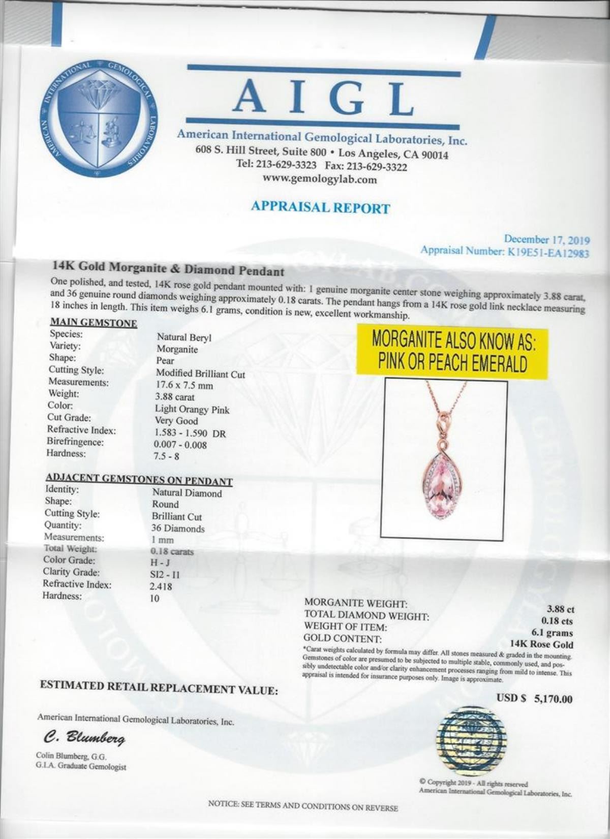 One 3.88ct Morganite and Diamond Pendant With Chain - 14KT Rose Gold. AIG certified. See Appraisal for more details. AIG Appraised.