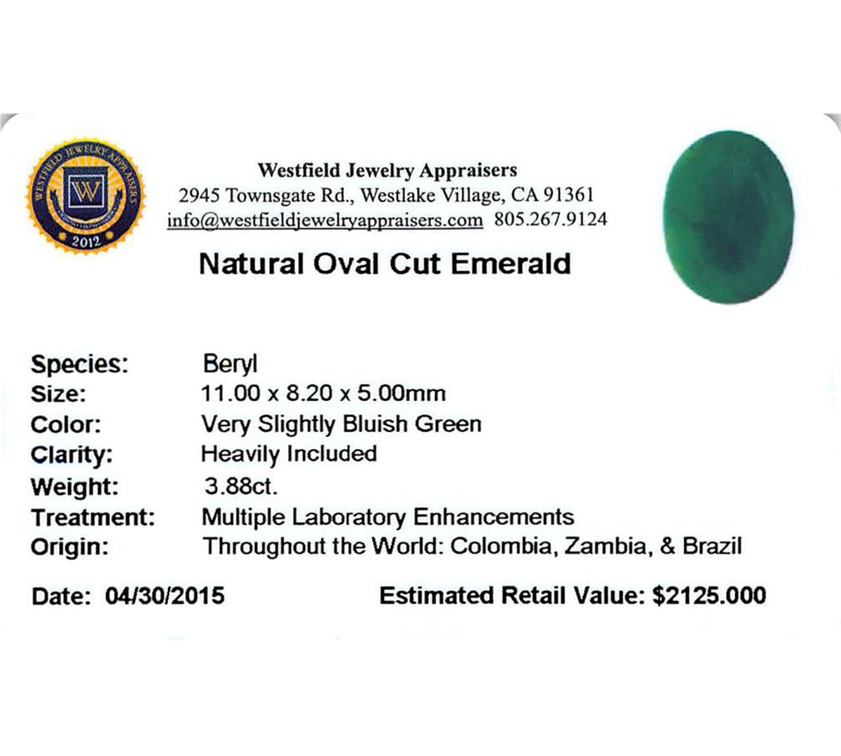 One oval cut natural emerald, measuring 11.00 x 8.20 x 5.00mm, exact weight 3.88ct., clarity is heavily included, type III, medium dark, very slightly grayish, very slightly bluish green color, (GIA vslbG 6/3), cut is good. Westfield Appraised at $2,125.00.