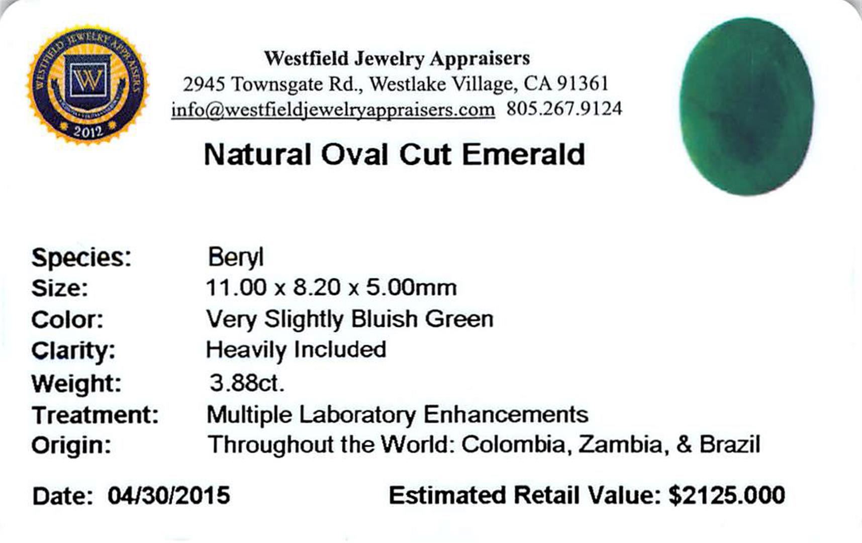 One oval cut natural emerald, measuring 11.00 x 8.20 x 5.00mm, exact weight 3.88ct., clarity is heavily included, type III, medium dark, very slightly grayish, very slightly bluish green color, (GIA vslbG 6/3), cut is good. Westfield Appraised at $2,125.00.