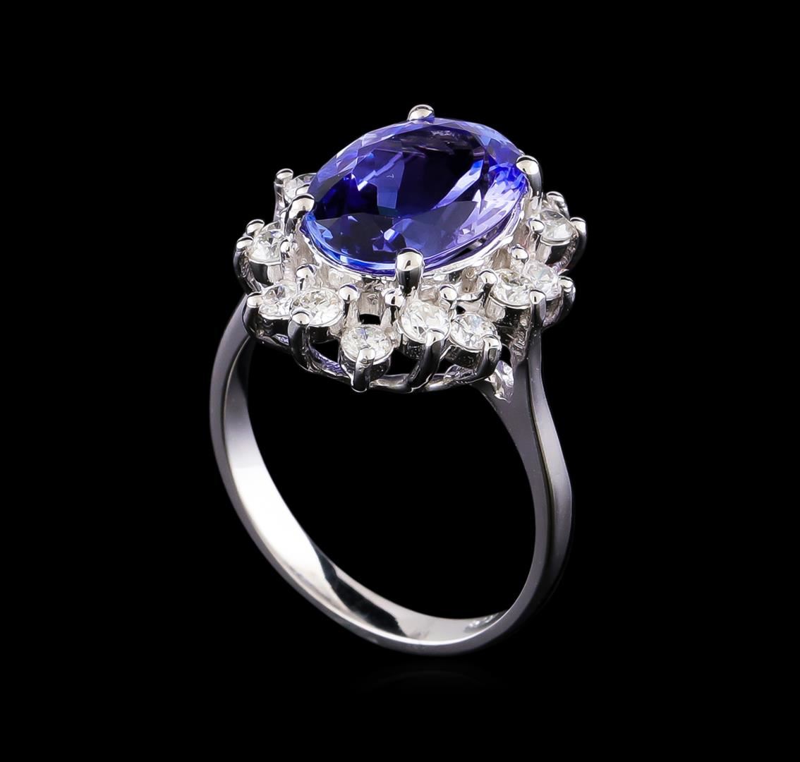 One electronically tested 14KT white gold lady's cast fashion ring with a basket halo with a bright polish finish. The featured lady's ring has a shank measuring 2.37 millimeters in width. Identified with markings of "K14". Condition is new, good workmanship. Containing: One prong set oval oval modified brilliant cut natural tanzanite, measuring 12.08 x 8.54 x 5.50mm, (depth est.) approximate weight of 3.88ct., clarity is eye clean, medium, moderately strong, violetish blue color, (GIA vB 5/4), cut is good. Transmitting light with no distortion, transparent. Colored gemstones are presumed to have been subjected to commonly used enhancement processes. Graded in the setting. Sixteen prong set round brilliant cut diamonds, measuring 2.30 - 2.20 x 1.37mm (depth est.) approximate total weight of 16 Stones = 0.68ct. Graded in the setting. Clarity: SI-1 to SI-2. Color: G - I. Cut Good. Total Weight of Colored Stones 3.88ct. Total Weight of Diamonds 0.68ct. Total Weight of Ring 5.20gm. GAS Appraised at $7,140.00.