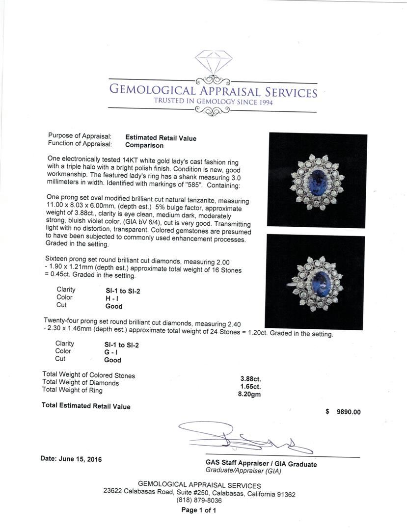 One electronically tested 14KT white gold lady's cast fashion ring with a triple halo with a bright polish finish. The featured lady's ring has a shank measuring 3.0 millimeters in width. Identified with markings of "585". Condition is new, good workmanship. Containing: One prong set oval modified brilliant cut natural tanzanite, measuring 11.00 x 8.03 x 6.00mm, (depth est.) 5%. bulge factor, approximate weight of 3.88ct., clarity is eye clean, medium dark, moderately strong, bluish violet color, (GIA bV 6/4), cut is very good. Transmitting light with no distortion, transparent. Colored gemstones are presumed to have been subjected to commonly used enhancement processes. Graded in the setting. Sixteen prong set round brilliant cut diamonds, measuring 2.00 - 1.90 x 1.21mm (depth est.) approximate total weight of 16 Stones = 0.45ct. Graded in the setting. Clarity: SI-1 to SI-2. Color: H - I. Cut Good Twenty-Four prong set round brilliant cut diamonds, measuring 2.40 - 2.30 x 1.46mm (depth est.) approximate total weight of 24 Stones = 1.20ct. Graded in the setting. Clarity: SI-1 to SI-2. Color: G - I. Cut Good. Total Weight of Colored Stones 3.88ct. Total Weight of Diamonds 1.65ct. Total Weight of Ring 8.20gm. GAS Appraised at $9,890.00.