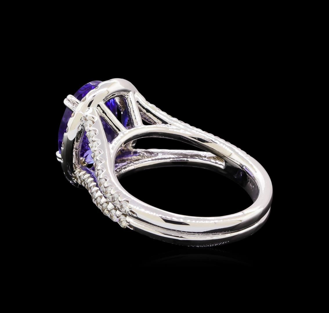 One electronically tested 14KT white gold lady's cast fashion ring with a split shank halo with a bright polish finish. Featured lady's ring has a double shank measuring 3.78 millimeters in length. Identified with markings of "14K". Condition is new, good workmanship. Containing: One prong set oval modified brilliant cut natural tanzanite, measuring 11.24 x 8.50 x 5.85mm, (depth est.) approximate weight of 3.88ct., clarity is eye clean, medium dark, moderately strong, bluish violet color, (GIA bV 6/4), cut is good. Transmitting light with no distortion, transparent. Colored gemstones are presumed to have been subjected to commonly used enhancement processes. Graded in the setting. Sixty prong set round brilliant cut diamonds, measuring 1.60 - 1.55 x 0.98mm (depth est.) approximate total weight of 60 Stones = 0.90ct. Graded in the setting. Clarity: VS-2 to SI-2. Color: G - Good. Total Weight of Colored Stones 3.88ct. Total Weight of Diamonds 0.90ct. Total Weight of Ring 7.60gm. GAS Appraised at $10,115.00.