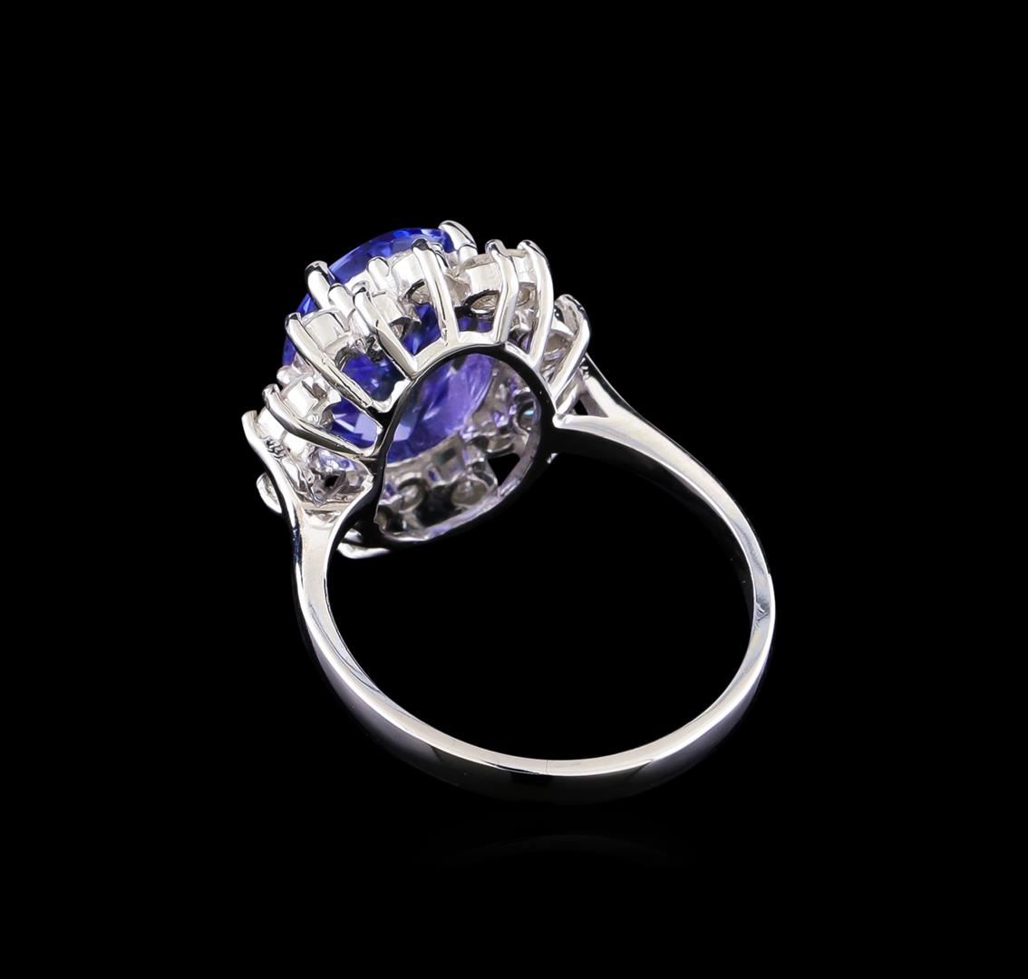 One electronically tested 14KT white gold lady's cast fashion ring with a basket halo with a bright polish finish. The featured lady's ring has a shank measuring 2.37 millimeters in width. Identified with markings of "K14". Condition is new, good workmanship. Containing: One prong set oval oval modified brilliant cut natural tanzanite, measuring 12.08 x 8.54 x 5.50mm, (depth est.) approximate weight of 3.88ct., clarity is eye clean, medium, moderately strong, violetish blue color, (GIA vB 5/4), cut is good. Transmitting light with no distortion, transparent. Colored gemstones are presumed to have been subjected to commonly used enhancement processes. Graded in the setting. Sixteen prong set round brilliant cut diamonds, measuring 2.30 - 2.20 x 1.37mm (depth est.) approximate total weight of 16 Stones = 0.68ct. Graded in the setting. Clarity: SI-1 to SI-2. Color: G - I. Cut Good. Total Weight of Colored Stones 3.88ct. Total Weight of Diamonds 0.68ct. Total Weight of Ring 5.20gm. GAS Appraised at $7,140.00.