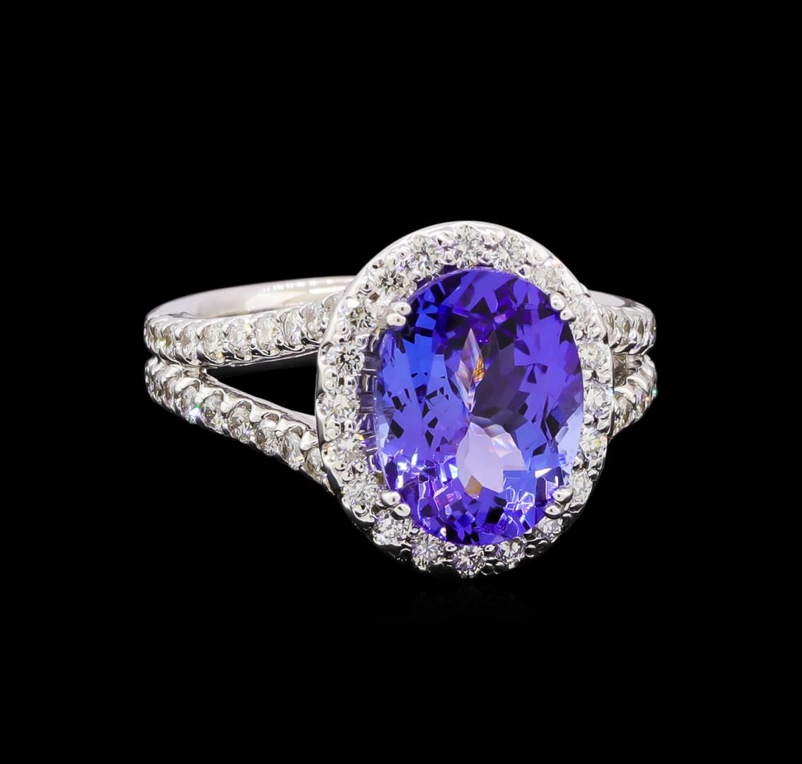One electronically tested 14KT white gold lady's cast fashion ring with a split shank halo with a bright polish finish. Featured lady's ring has a double shank measuring 3.78 millimeters in length. Identified with markings of "14K". Condition is new, good workmanship. Containing: One prong set oval modified brilliant cut natural tanzanite, measuring 11.24 x 8.50 x 5.85mm, (depth est.) approximate weight of 3.88ct., clarity is eye clean, medium dark, moderately strong, bluish violet color, (GIA bV 6/4), cut is good. Transmitting light with no distortion, transparent. Colored gemstones are presumed to have been subjected to commonly used enhancement processes. Graded in the setting. Sixty prong set round brilliant cut diamonds, measuring 1.60 - 1.55 x 0.98mm (depth est.) approximate total weight of 60 Stones = 0.90ct. Graded in the setting. Clarity: VS-2 to SI-2. Color: G - Good. Total Weight of Colored Stones 3.88ct. Total Weight of Diamonds 0.90ct. Total Weight of Ring 7.60gm. GAS Appraised at $10,115.00.