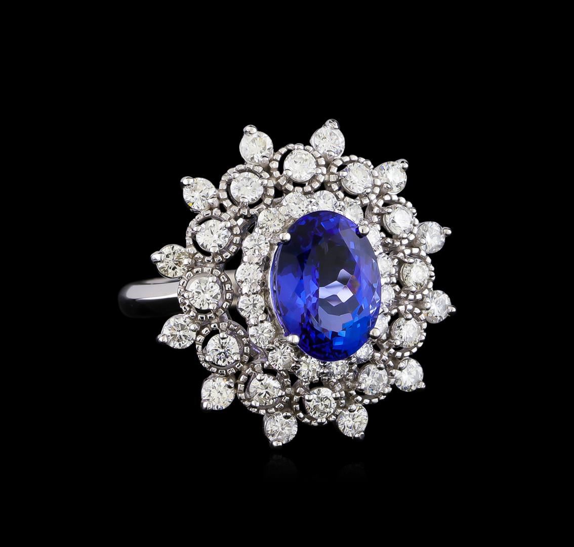 One electronically tested 14KT white gold lady's cast fashion ring with a triple halo with a bright polish finish. The featured lady's ring has a shank measuring 3.0 millimeters in width. Identified with markings of "585". Condition is new, good workmanship. Containing: One prong set oval modified brilliant cut natural tanzanite, measuring 11.00 x 8.03 x 6.00mm, (depth est.) 5%. bulge factor, approximate weight of 3.88ct., clarity is eye clean, medium dark, moderately strong, bluish violet color, (GIA bV 6/4), cut is very good. Transmitting light with no distortion, transparent. Colored gemstones are presumed to have been subjected to commonly used enhancement processes. Graded in the setting. Sixteen prong set round brilliant cut diamonds, measuring 2.00 - 1.90 x 1.21mm (depth est.) approximate total weight of 16 Stones = 0.45ct. Graded in the setting. Clarity: SI-1 to SI-2. Color: H - I. Cut Good Twenty-Four prong set round brilliant cut diamonds, measuring 2.40 - 2.30 x 1.46mm (depth est.) approximate total weight of 24 Stones = 1.20ct. Graded in the setting. Clarity: SI-1 to SI-2. Color: G - I. Cut Good. Total Weight of Colored Stones 3.88ct. Total Weight of Diamonds 1.65ct. Total Weight of Ring 8.20gm. GAS Appraised at $9,890.00.