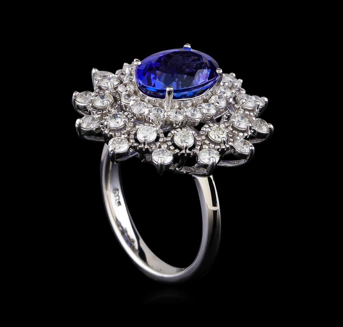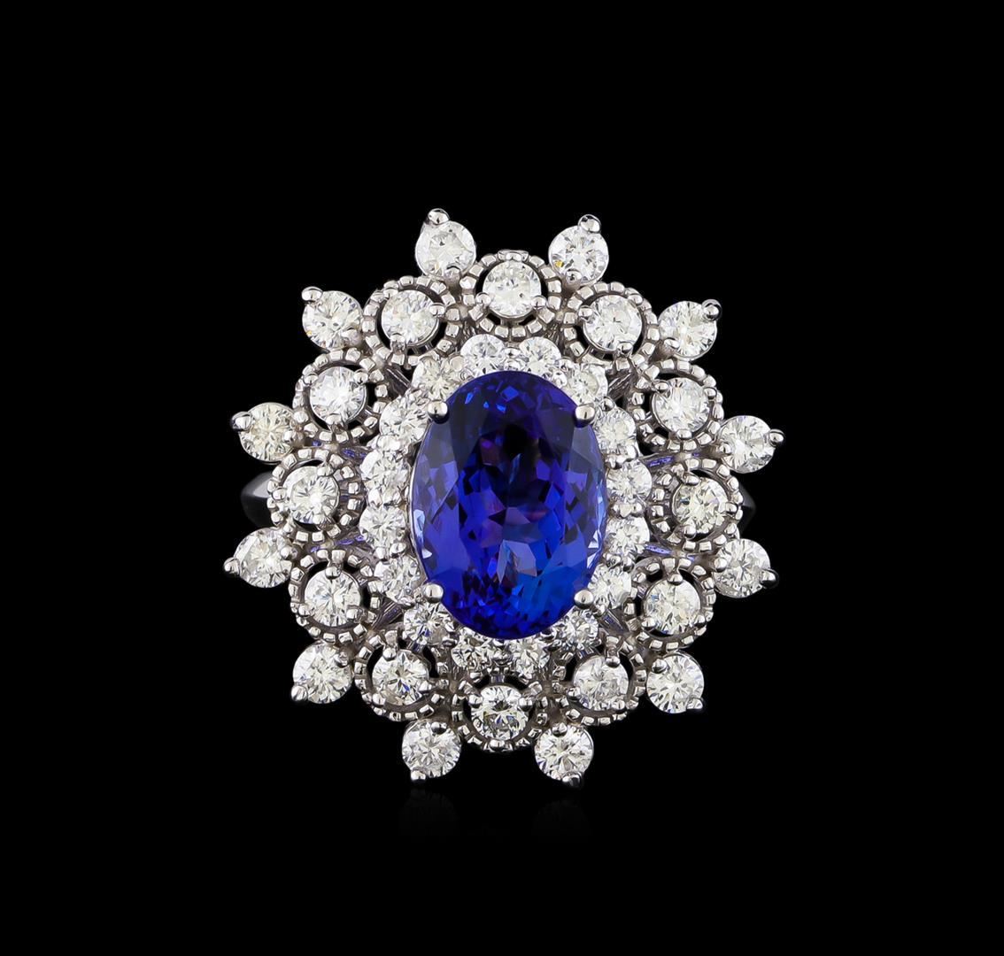 One electronically tested 14KT white gold lady's cast fashion ring with a triple halo with a bright polish finish. The featured lady's ring has a shank measuring 3.0 millimeters in width. Identified with markings of "585". Condition is new, good workmanship. Containing: One prong set oval modified brilliant cut natural tanzanite, measuring 11.00 x 8.03 x 6.00mm, (depth est.) 5%. bulge factor, approximate weight of 3.88ct., clarity is eye clean, medium dark, moderately strong, bluish violet color, (GIA bV 6/4), cut is very good. Transmitting light with no distortion, transparent. Colored gemstones are presumed to have been subjected to commonly used enhancement processes. Graded in the setting. Sixteen prong set round brilliant cut diamonds, measuring 2.00 - 1.90 x 1.21mm (depth est.) approximate total weight of 16 Stones = 0.45ct. Graded in the setting. Clarity: SI-1 to SI-2. Color: H - I. Cut Good Twenty-Four prong set round brilliant cut diamonds, measuring 2.40 - 2.30 x 1.46mm (depth est.) approximate total weight of 24 Stones = 1.20 ct. Graded in the setting. Clarity: SI-1 to SI-2. Color: G - I. Cut Good. Total Weight of Colored Stones 3.88ct. Total Weight of Diamonds 1.65ct. Total Weight of Ring 8.20gm. GAS Appraised.