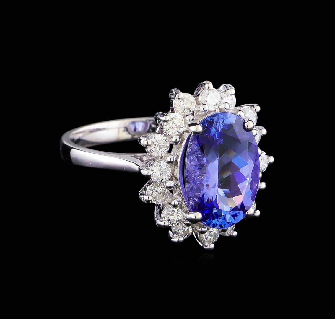 One electronically tested 14KT white gold lady's cast fashion ring with a basket halo with a bright polish finish. The featured lady's ring has a shank measuring 2.37 millimeters in width. Identified with markings of "K14". Condition is new, good workmanship. Containing: One prong set oval oval modified brilliant cut natural tanzanite, measuring 12.08 x 8.54 x 5.50mm, (depth est.) approximate weight of 3.88ct., clarity is eye clean, medium, moderately strong, violetish blue color, (GIA vB 5/4), cut is good. Transmitting light with no distortion, transparent. Colored gemstones are presumed to have been subjected to commonly used enhancement processes. Graded in the setting. Sixteen prong set round brilliant cut diamonds, measuring 2.30 - 2.20 x 1.37mm (depth est.) approximate total weight of 16 Stones = 0.68ct. Graded in the setting. Clarity: SI-1 to SI-2. Color: G - I. Cut Good. Total Weight of Colored Stones 3.88ct. Total Weight of Diamonds 0.68ct. Total Weight of Ring 5.20gm.