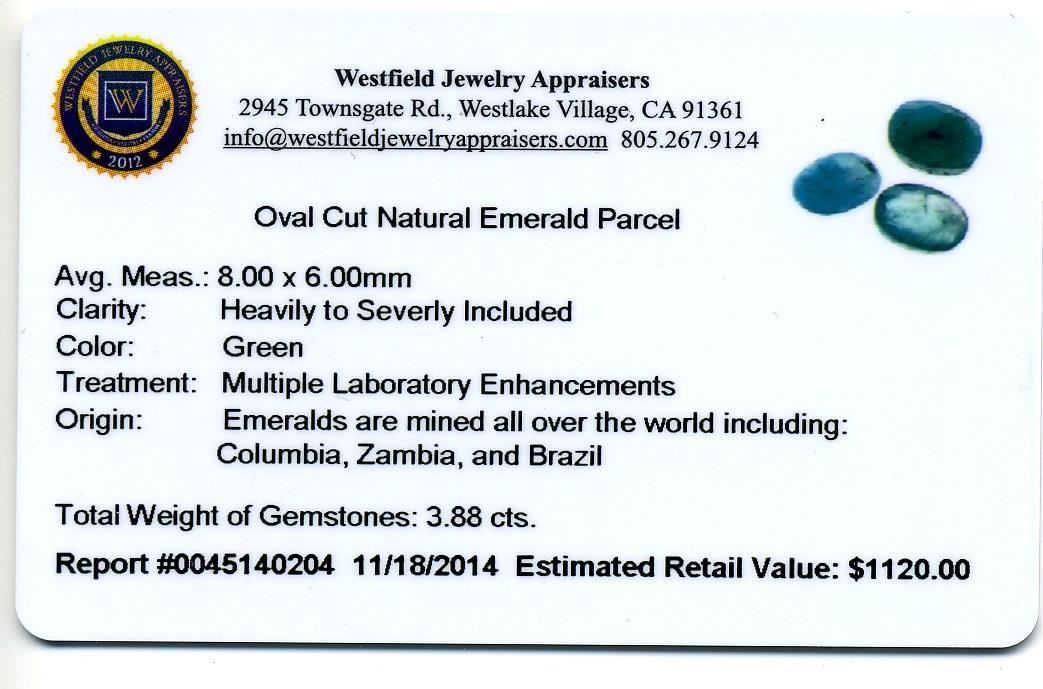 3.88cts. Oval Cut Natural Emerald Parcel Westfield Appraised at $1,120.00.